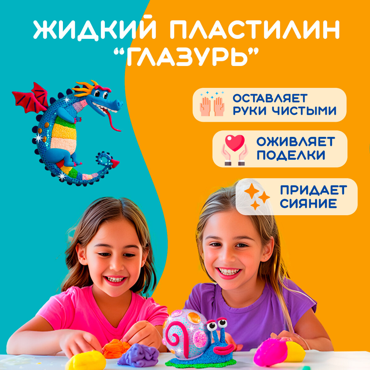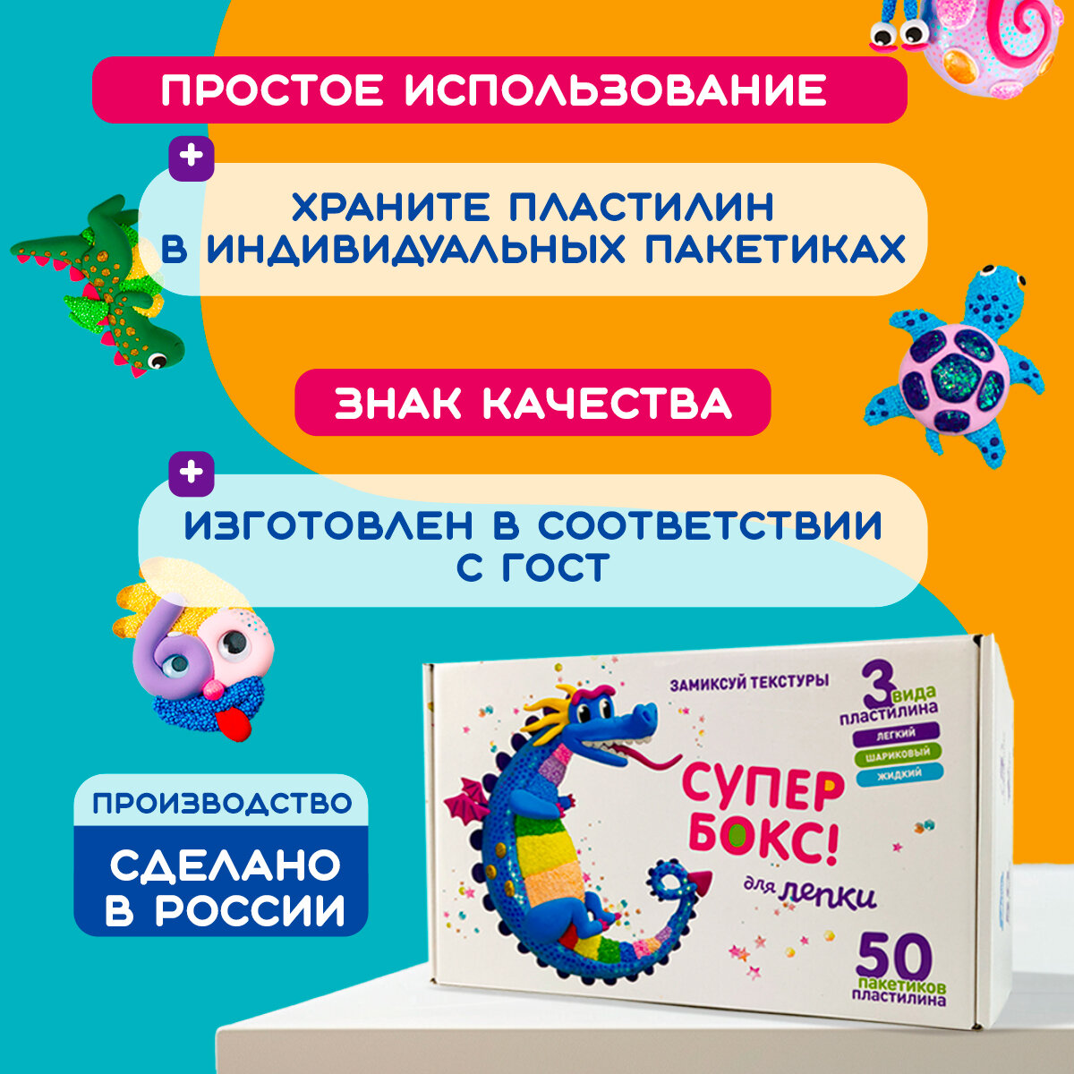| Комплектация | шариковый пластилин - 10 пакетиков; легкий пластилин - 40 пакетиков; жидкий пластилин - 1 пакетик; стеки для работы с пластилином - 3 шт; декоры; блестки; пакетики зип лок для хранения мягкого пластилина - 1 комплект; видео инструкция по лепке - 1 шт |