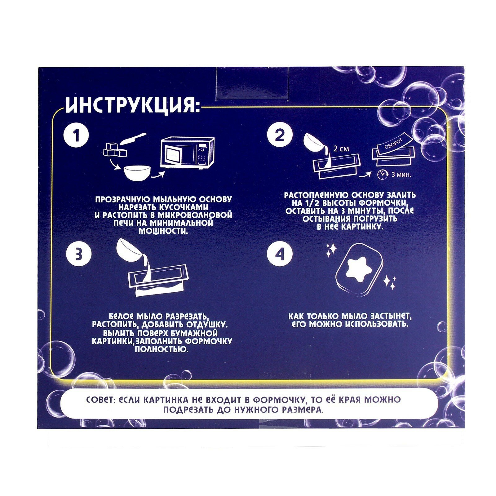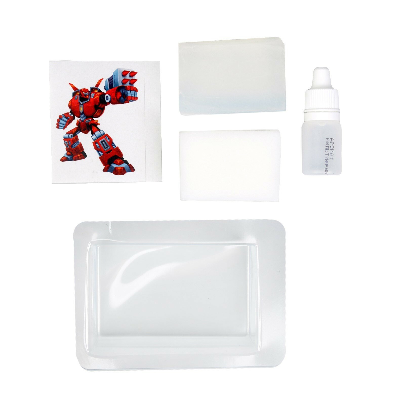| Комплектация | формочка, мыльная основа, водорастворимая картинка, отдушка, инструкция |
