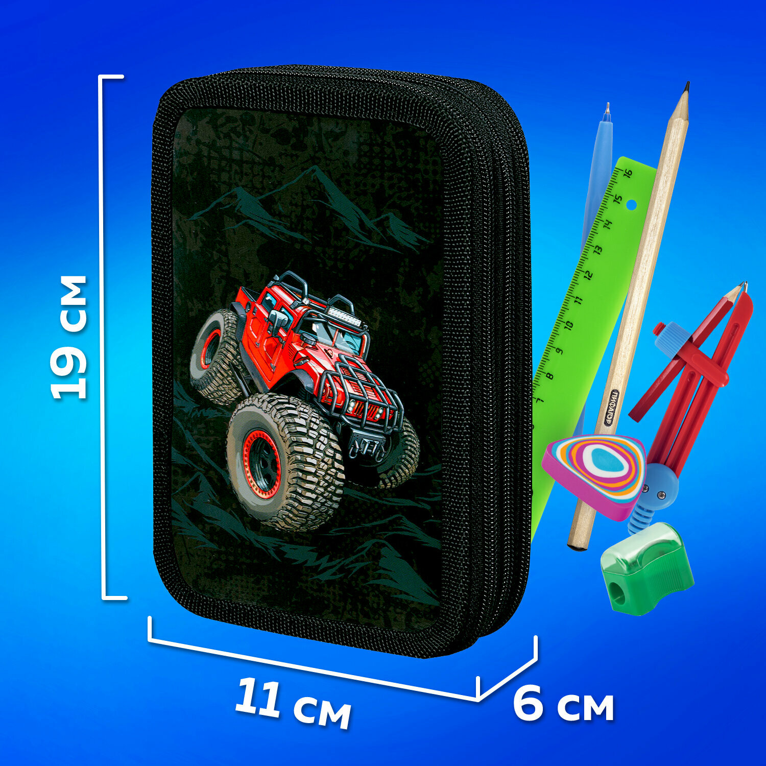 Пенал пифагор, 3 отделения, ламинированный картон, 19х11 см, "Big Wheels", 271548 интересное: