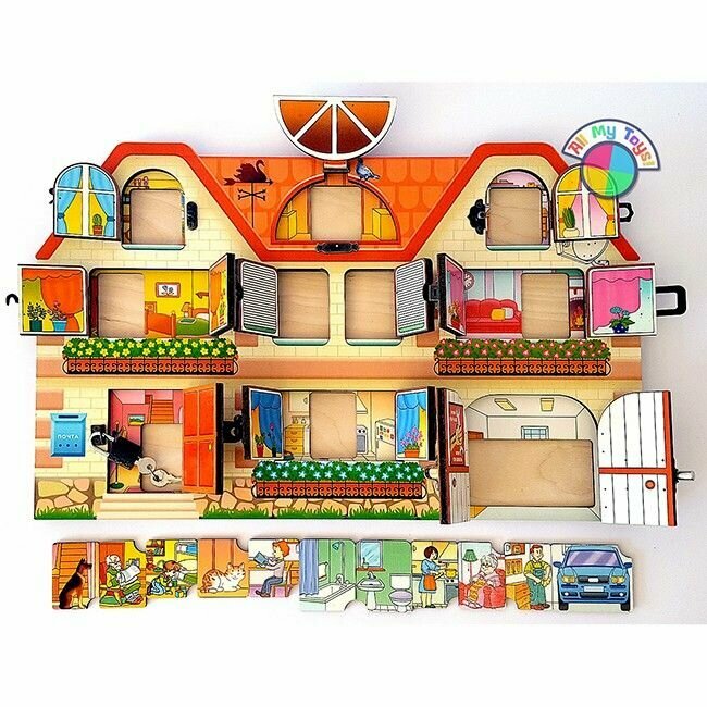 Можно придумывать игры с обязанностями домочадцев. Все детальки за дверцами и окошками вынимаются. Но они разного размера и не все можно поменять местами |