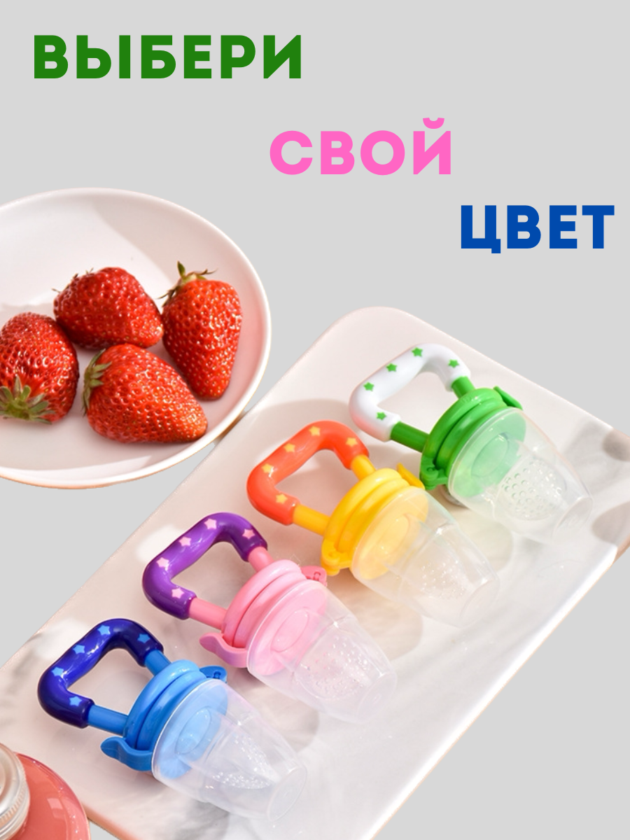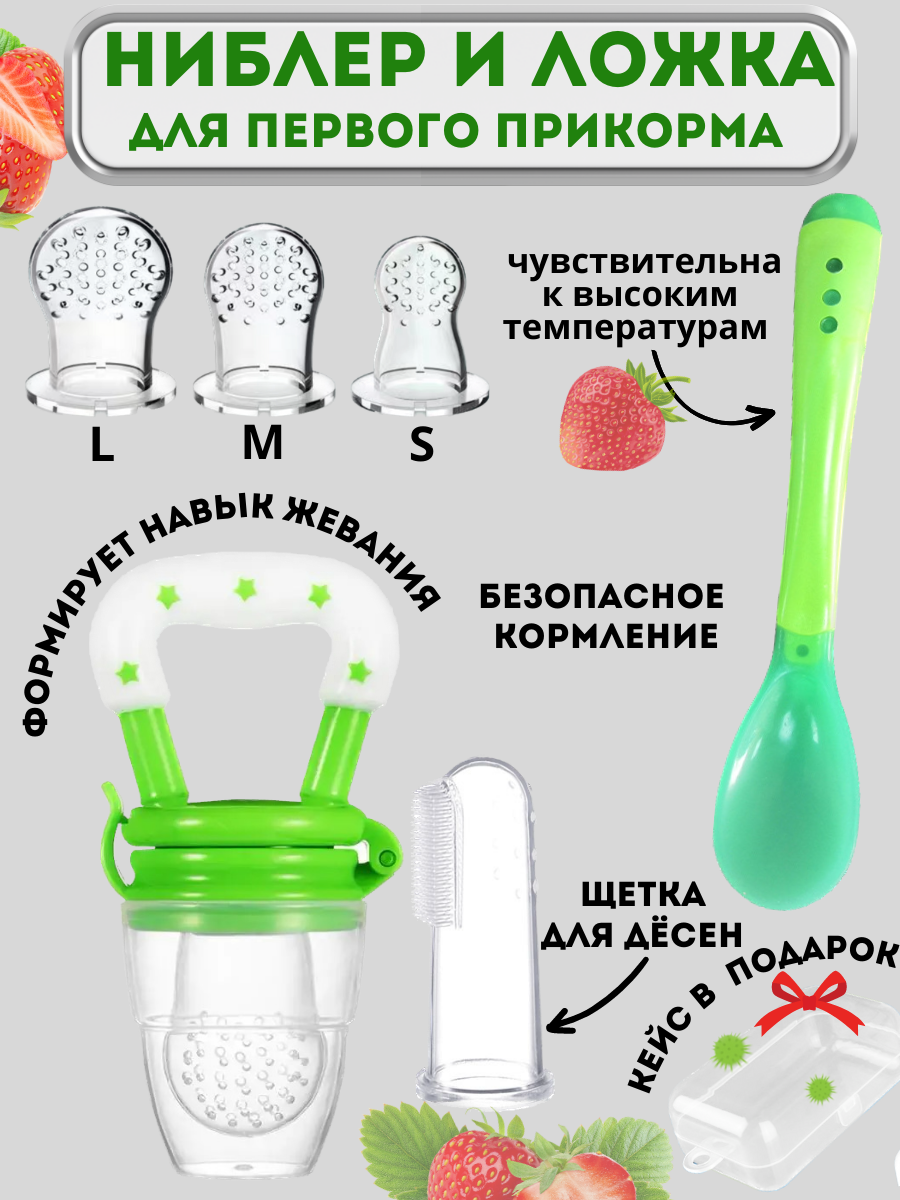 | Комплектация | силиконовый ниблер для прикорма малышей, 3 силиконовые соски сеточки разных размеров, силикновая детская ложка для кормления чувствительная к горячему, прорезывтель щетка на палец |