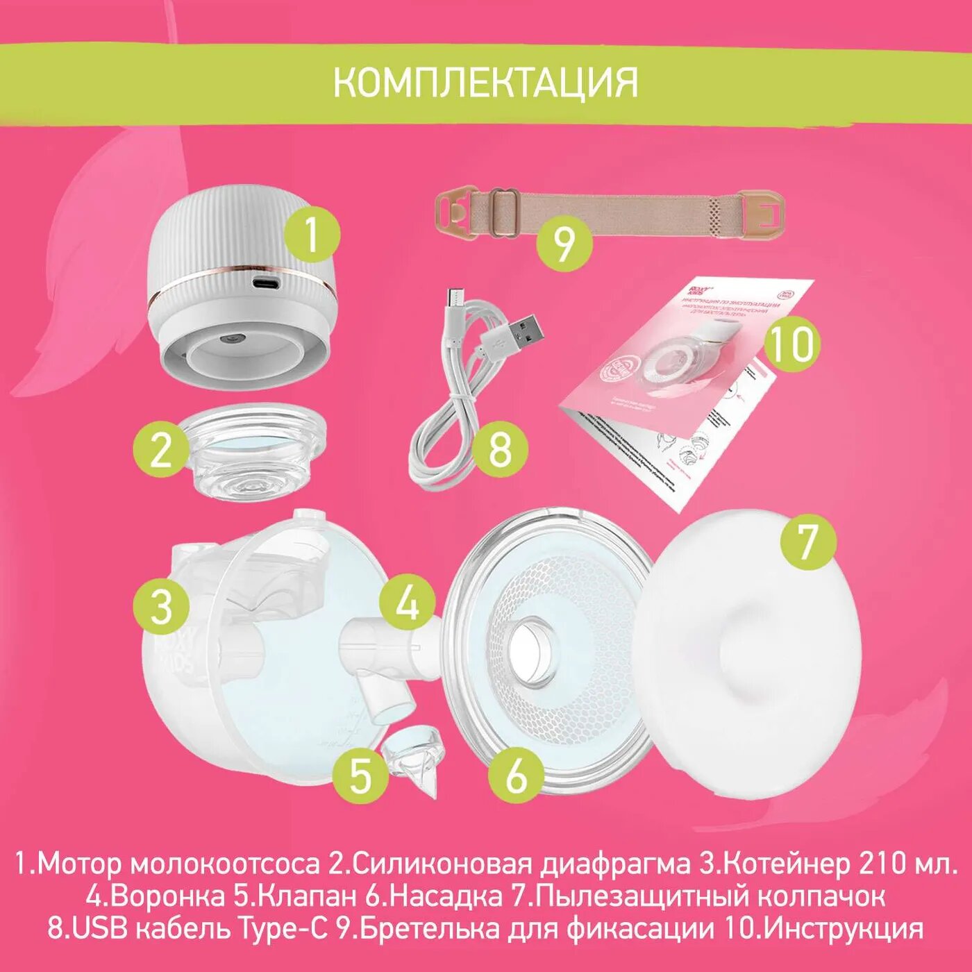 | Подробная комплектация | Воронка, мотор молокоотсоса, силиконовая диафрагма, контейнер 210мл, клапан, насадка, USB кабель TYPE-C, бретелька для фиксации, инструкция |