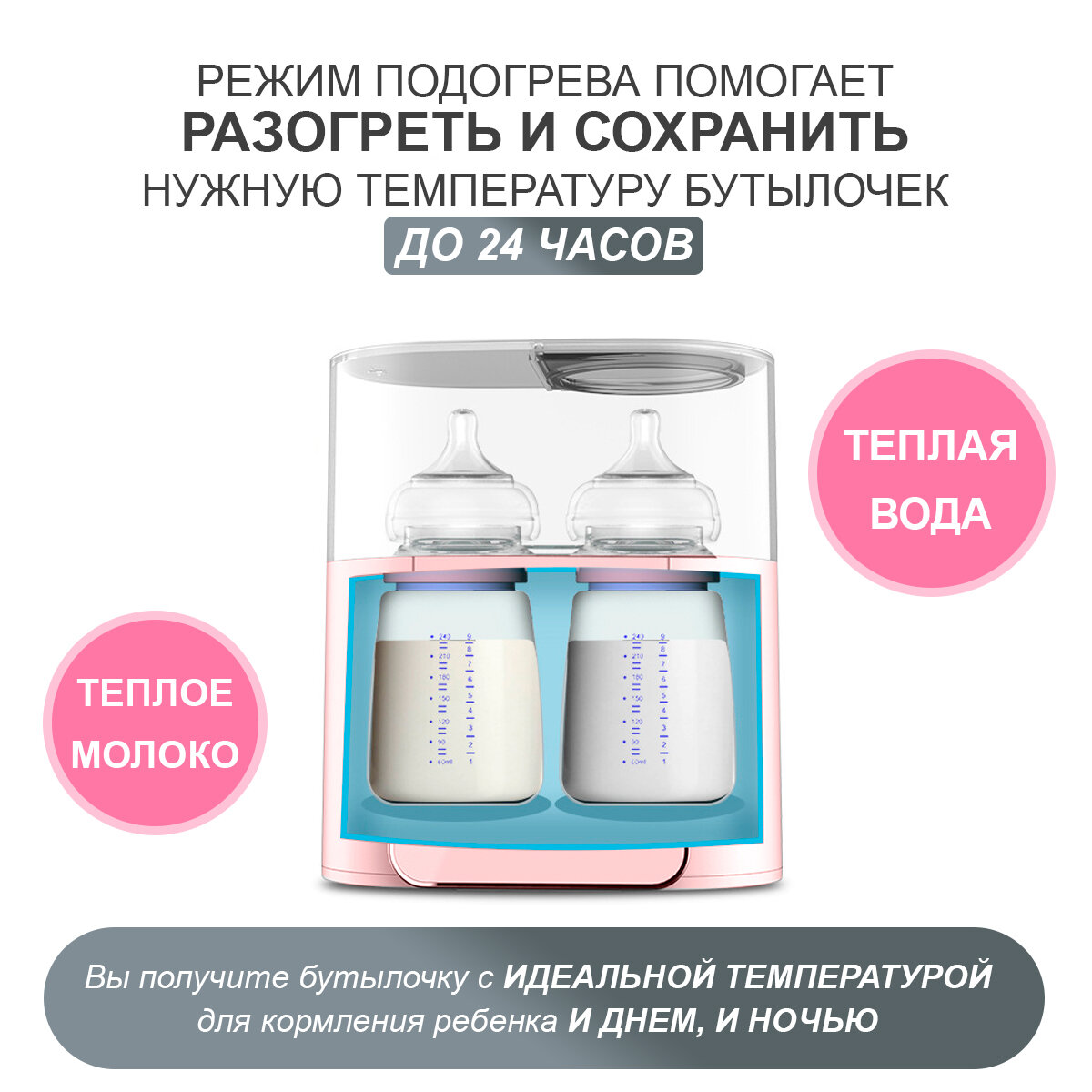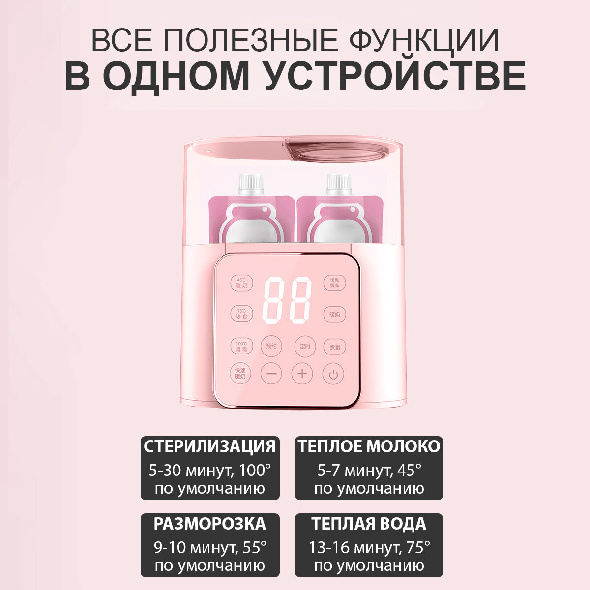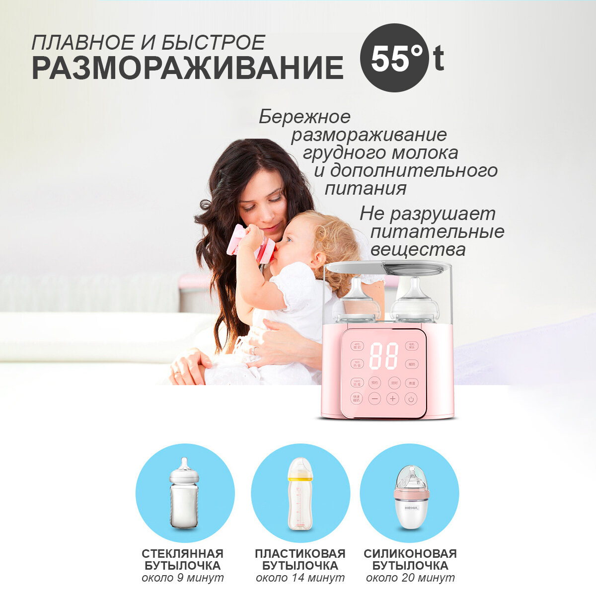 | Особенности | автоотключение, для всех типов бутылочек, поддержка заданной температуры, подогрев 2 бутылочек, функция разморозки |