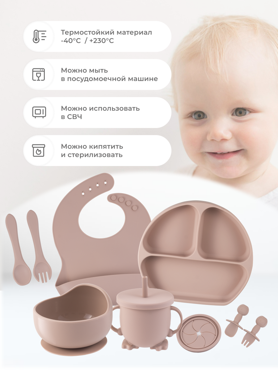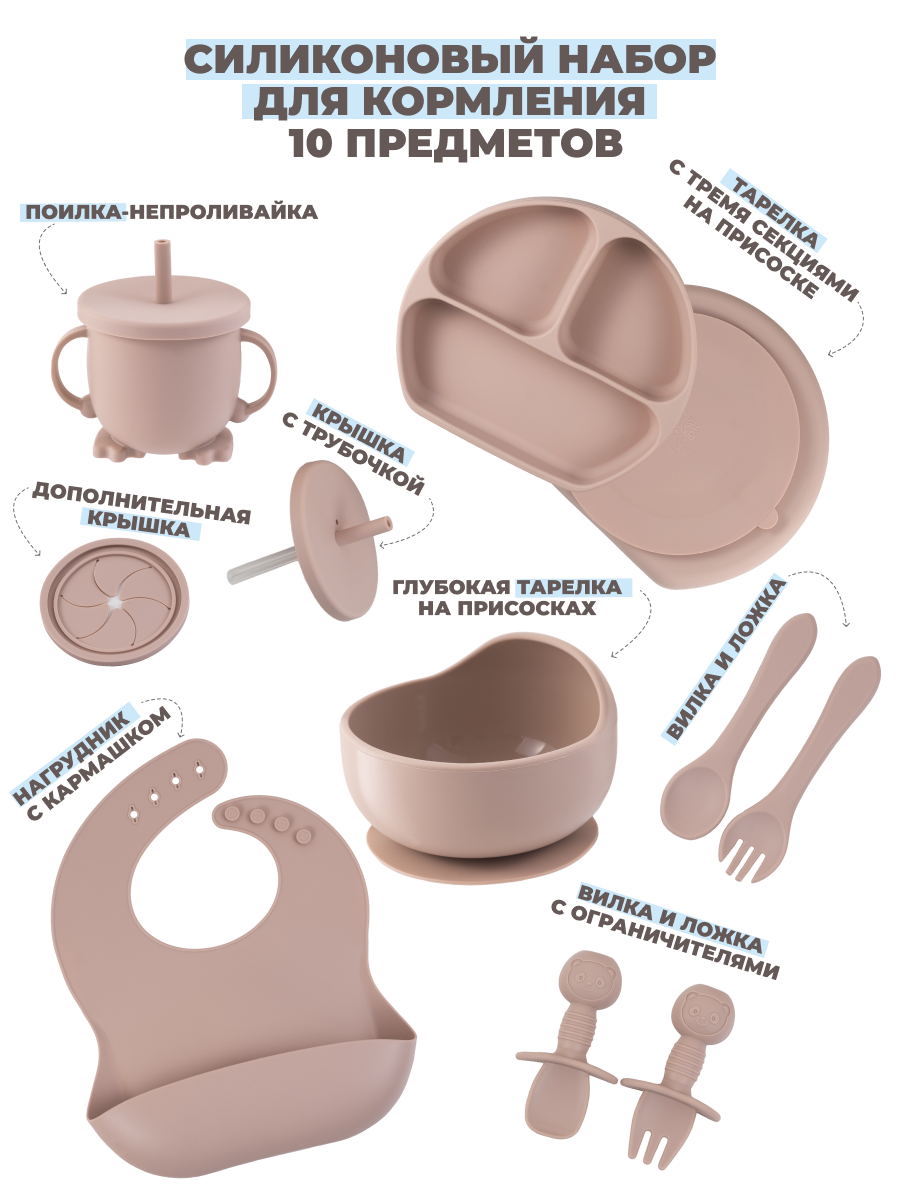 Детский силиконовый набор посуды для кормления малыша из 10 предметов