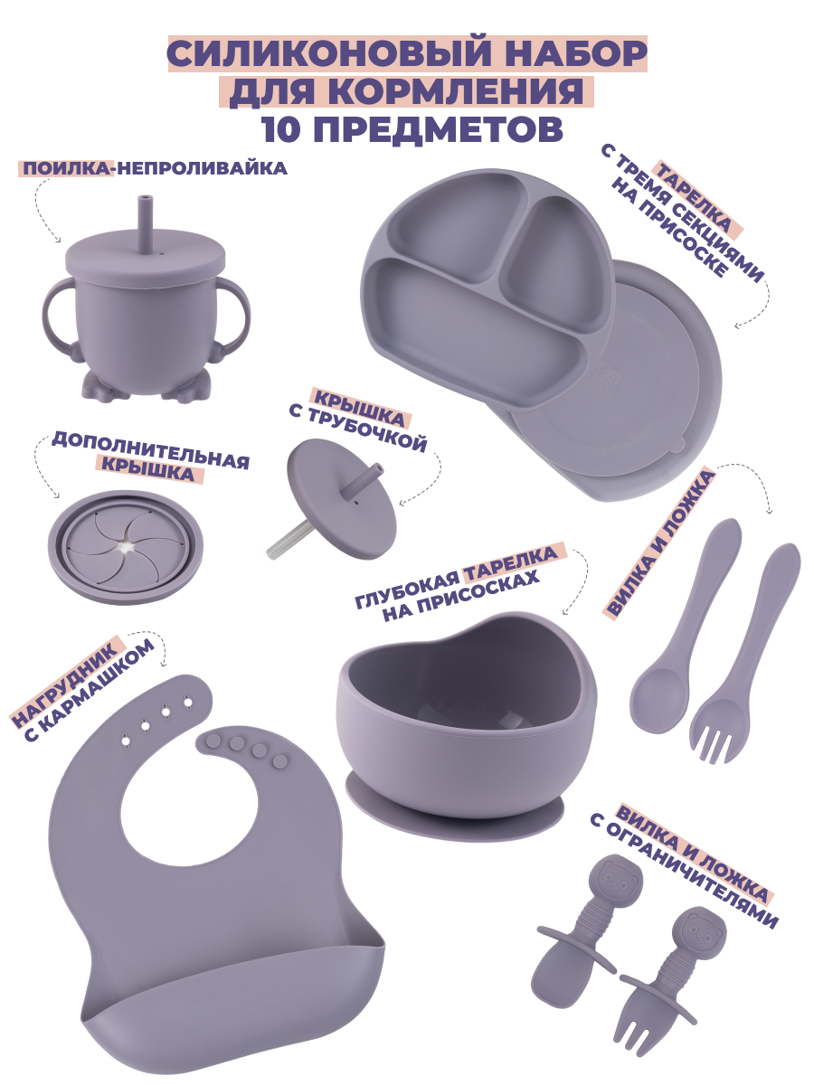 Детский силиконовый набор посуды для кормления малыша из 10 предметов