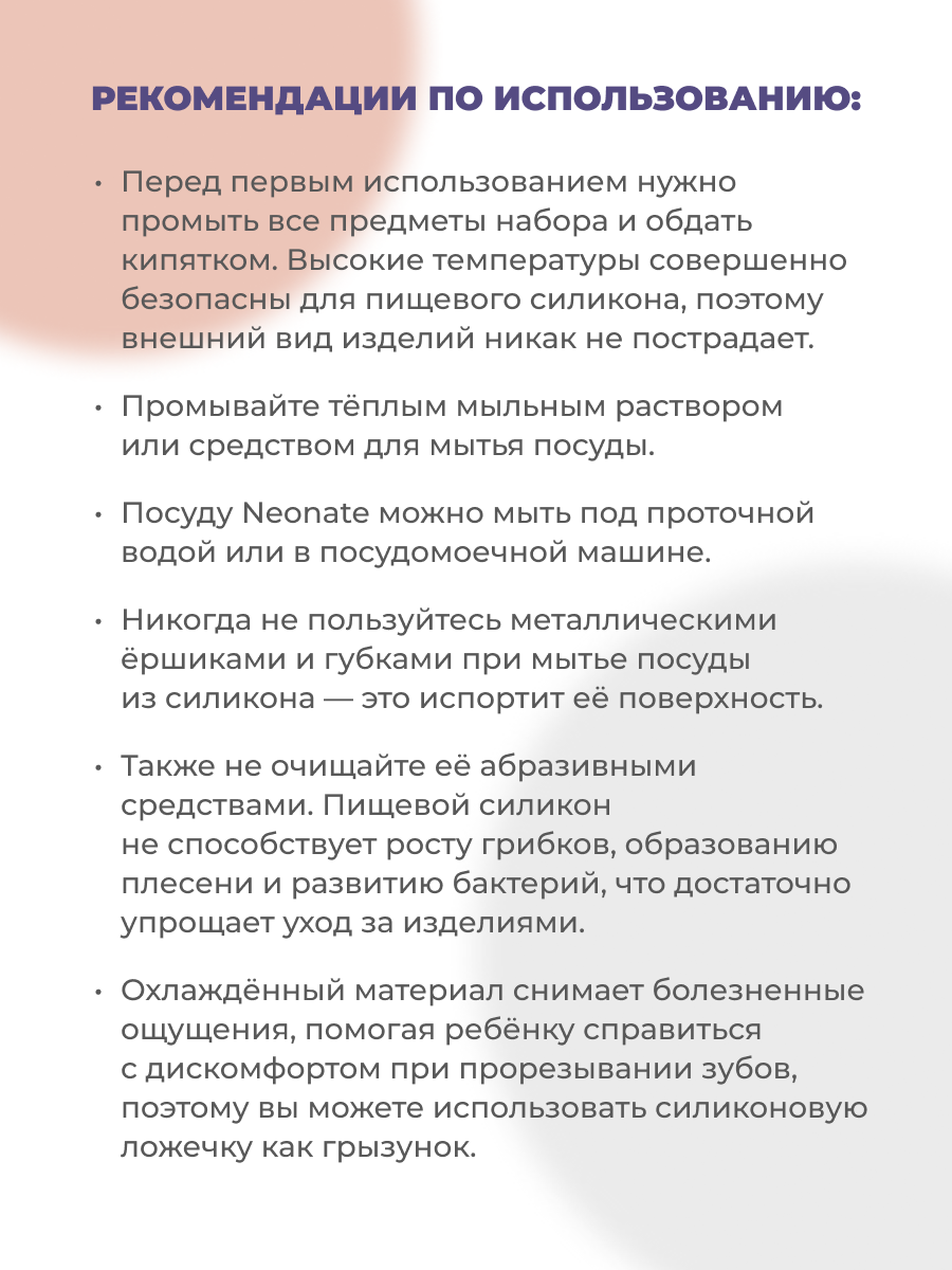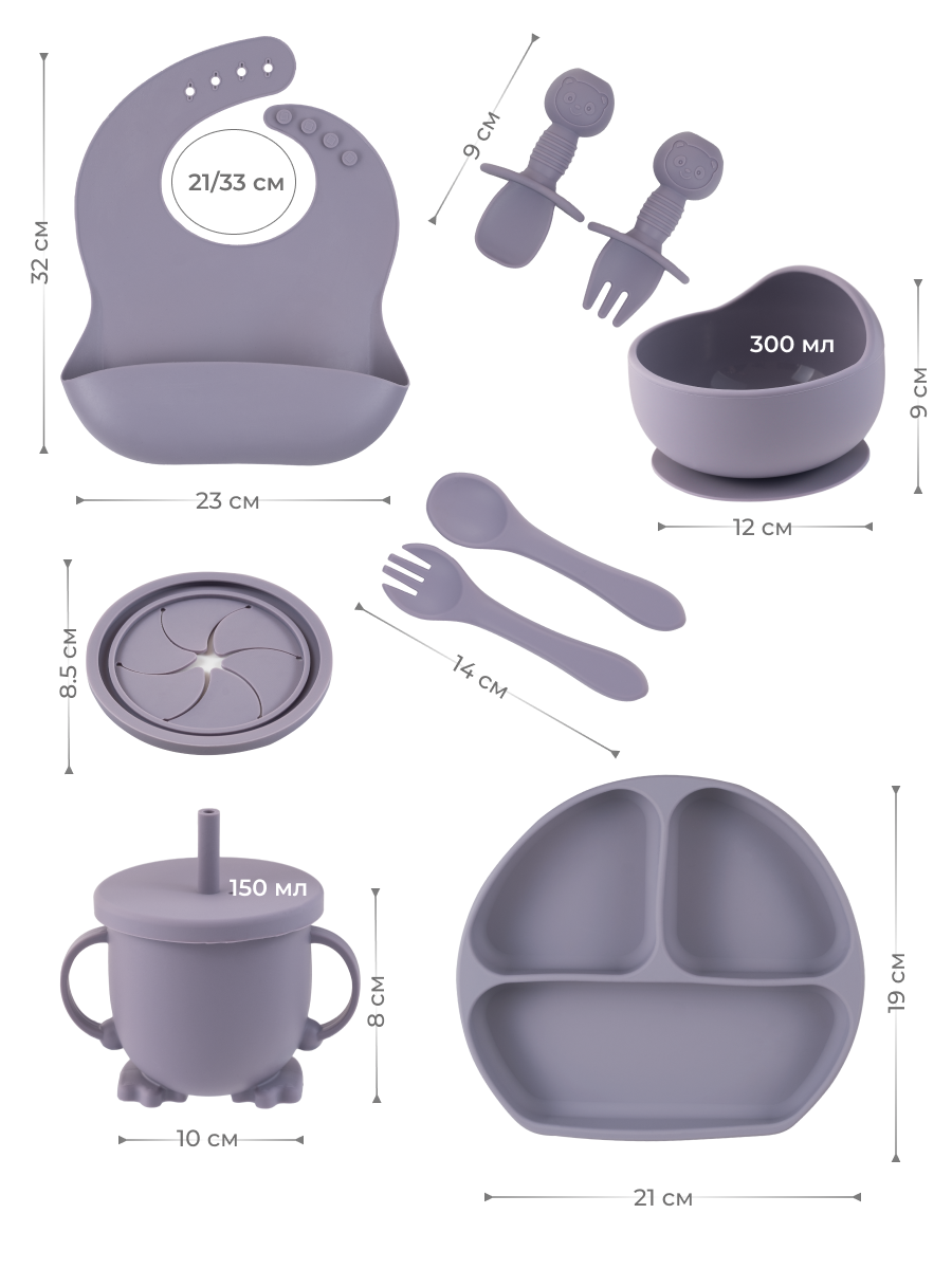 | Комплектация | ложка и вилка - 2 шт; нагрудник силиконовый - 1шт.; Непроливающий поильник 1 шт крышка -1шт.; Глубокая тарелка на присоске -1шт. Тарелка с 3 отделениями на присосках -1шт.; Крышка с трубочкой - 1шт. |