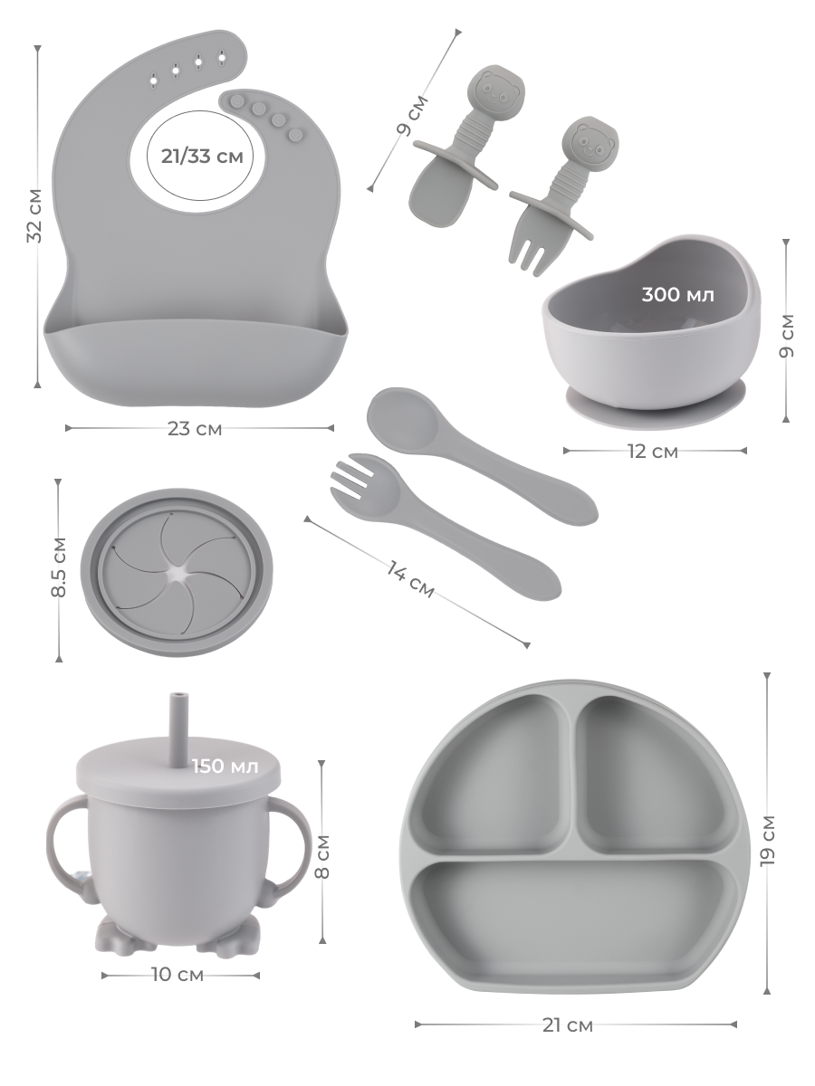 | Комплектация | ложка и вилка - 2 шт; нагрудник силиконовый - 1шт.; Непроливающий поильник 1 шт крышка -1шт.; Глубокая тарелка на присоске -1шт. Тарелка с 3 отделениями на присосках -1шт.; Крышка с трубочкой - 1шт. |