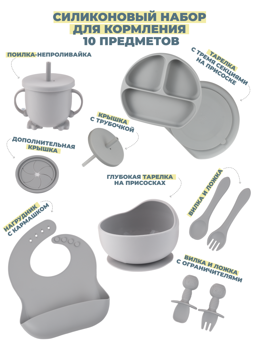 Детский силиконовый набор посуды для кормления малыша из 10 предметов