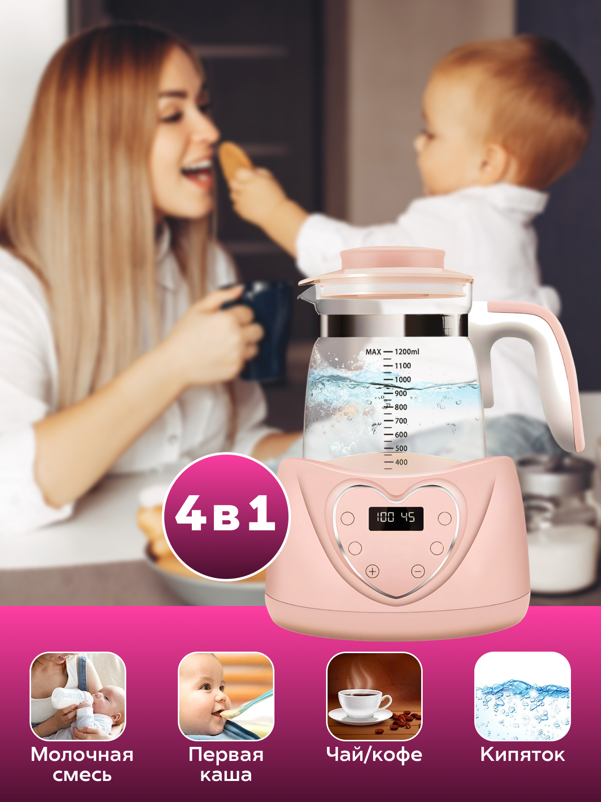 Подогреватель детского питания, стерилизатор бутылочек, сосок, многофункциональный чайник, с контролем температуры 1,2 л, поддержание температуры, таймер, сенсорное управление
