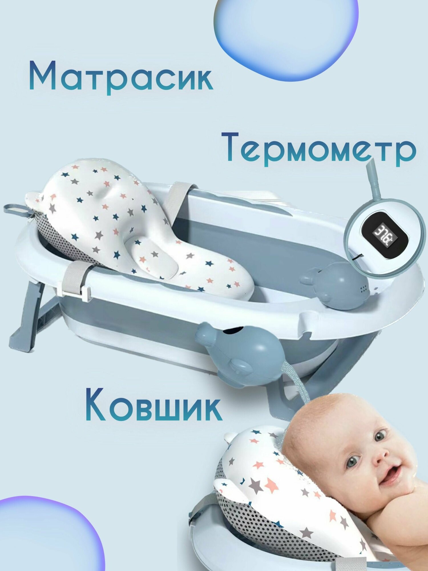 Складная ванночка для купания младенцев с термометром, для новорожденных и детей до 18 месяцев, с шапочкой и плавающим ковриком