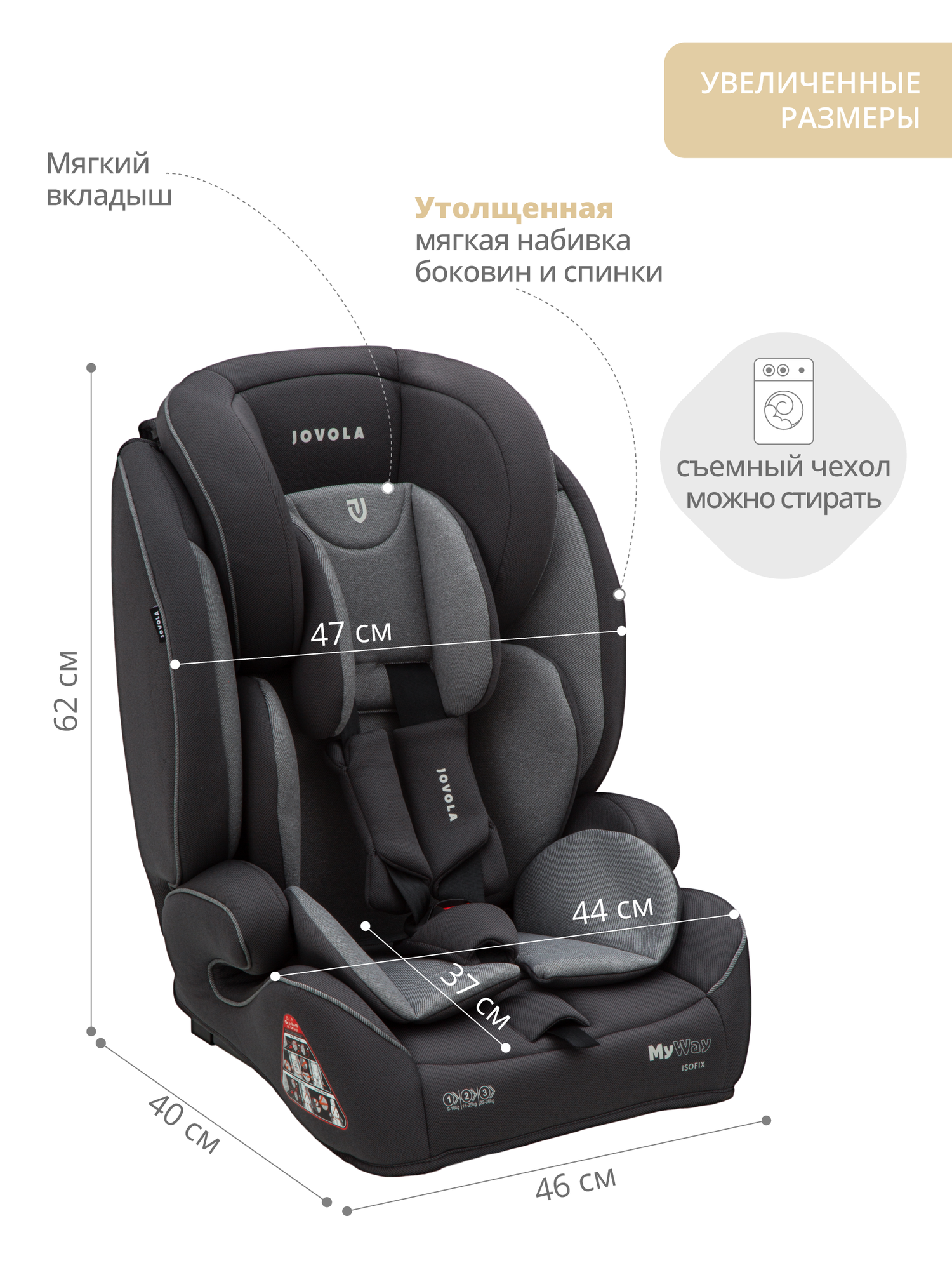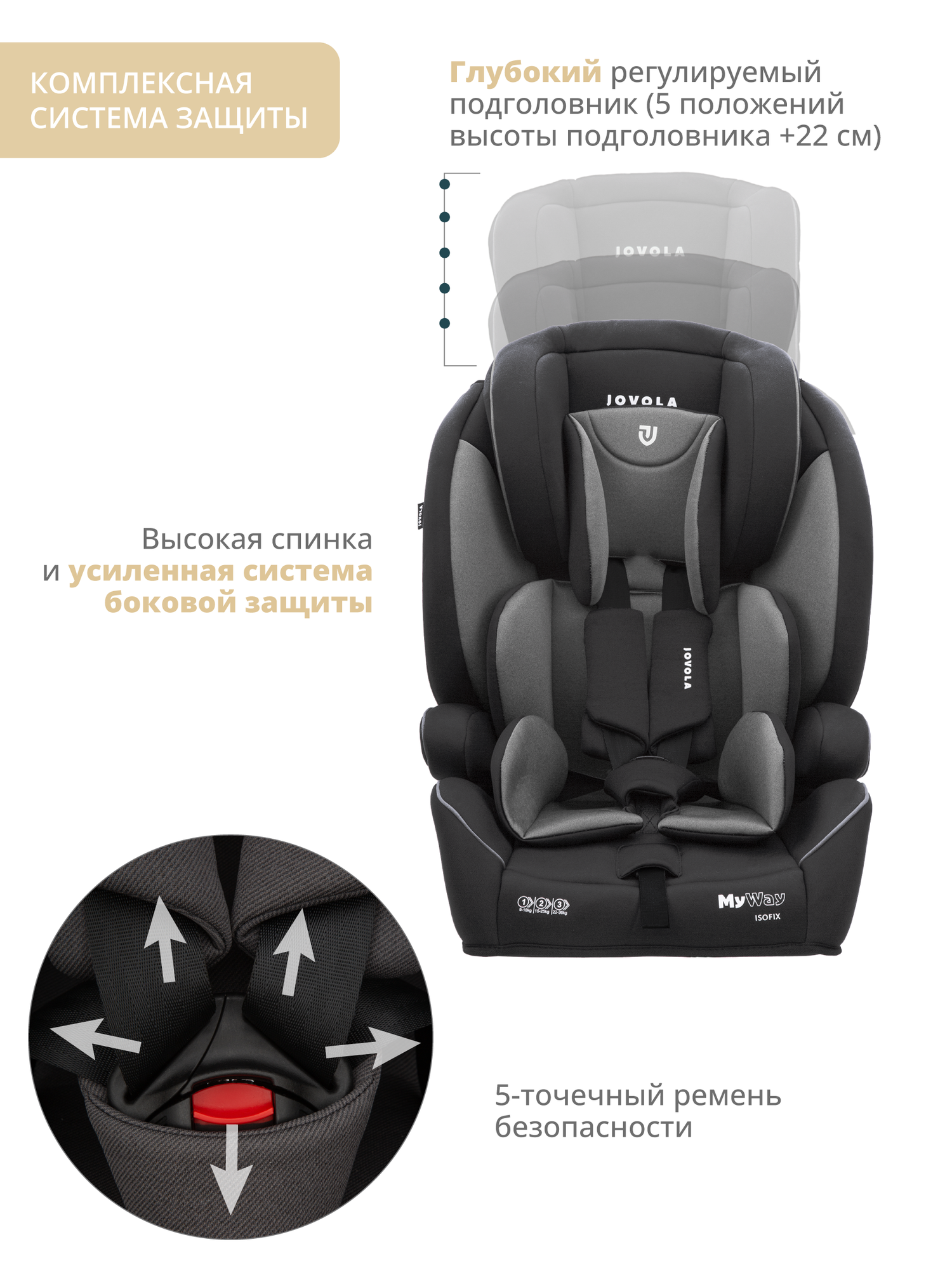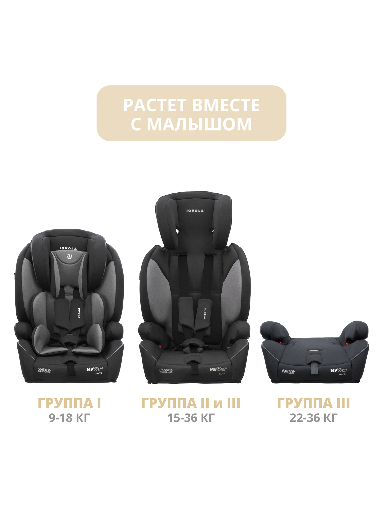 Автокресло бустер Jovola MyWay ISOFIX, группы 0/1/2/3 (до 36 кг), 3 (22-36 кг), до 12 лет, черный-серый