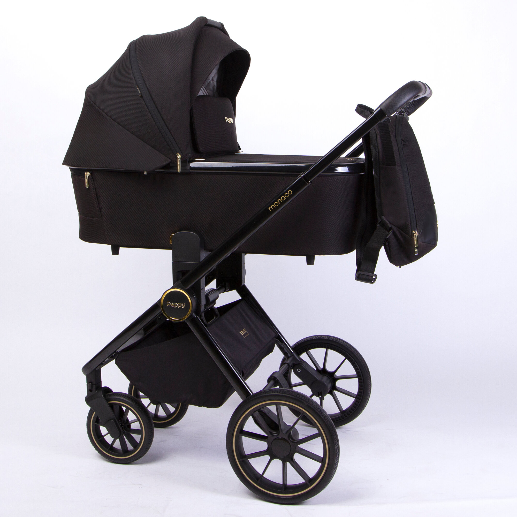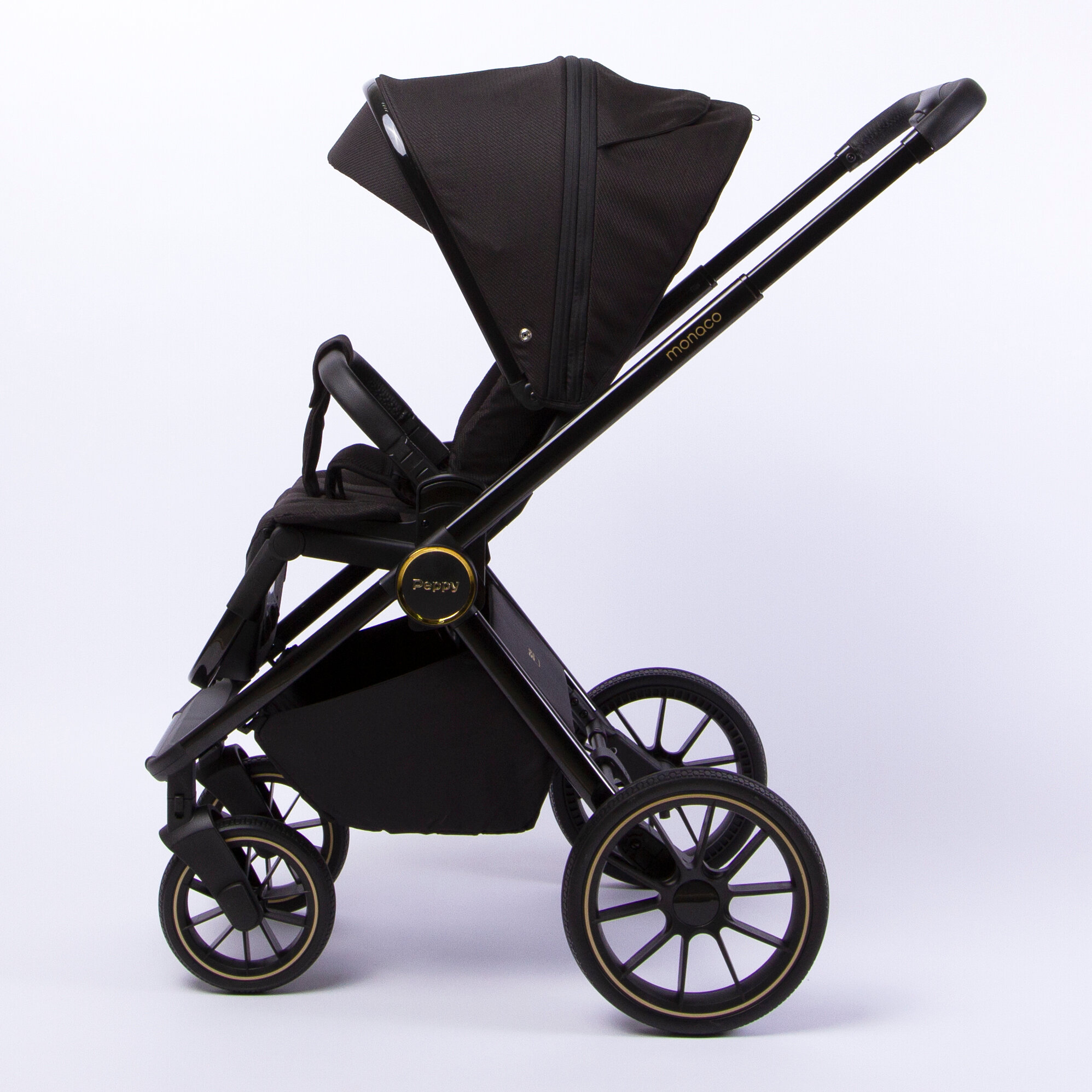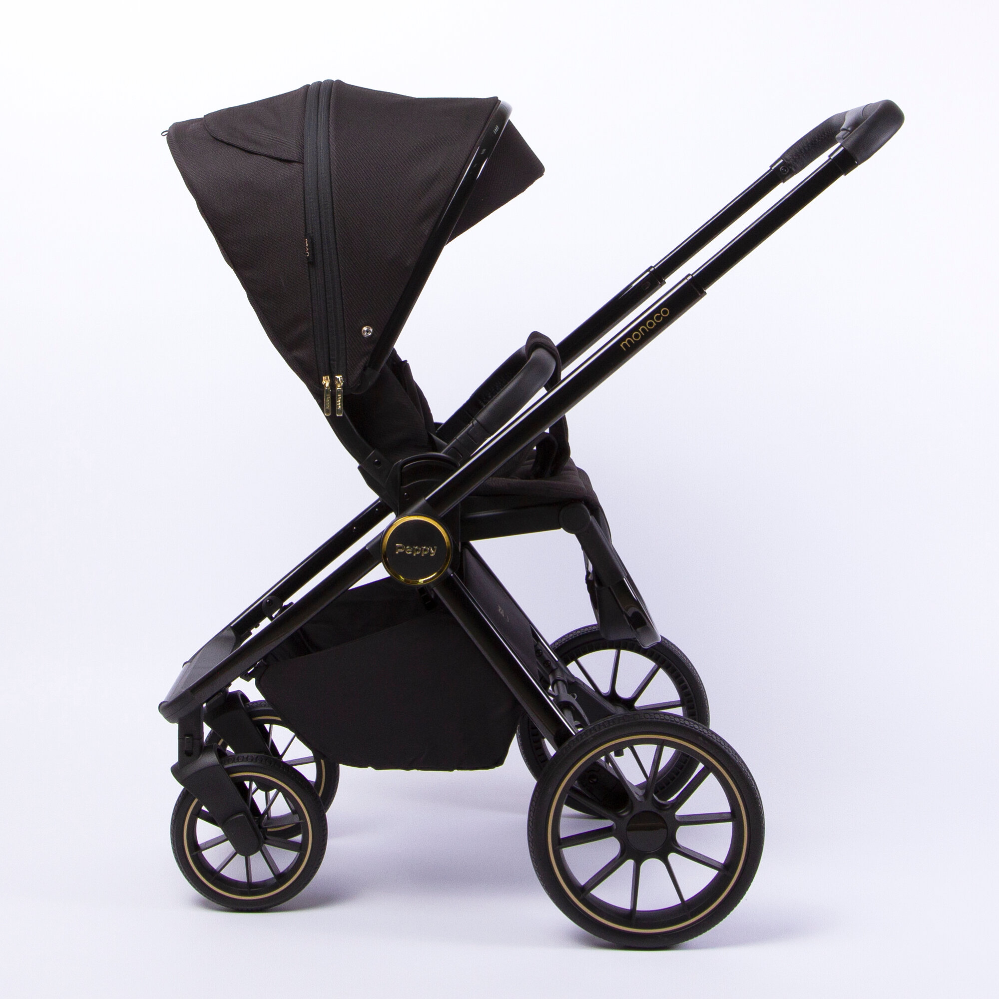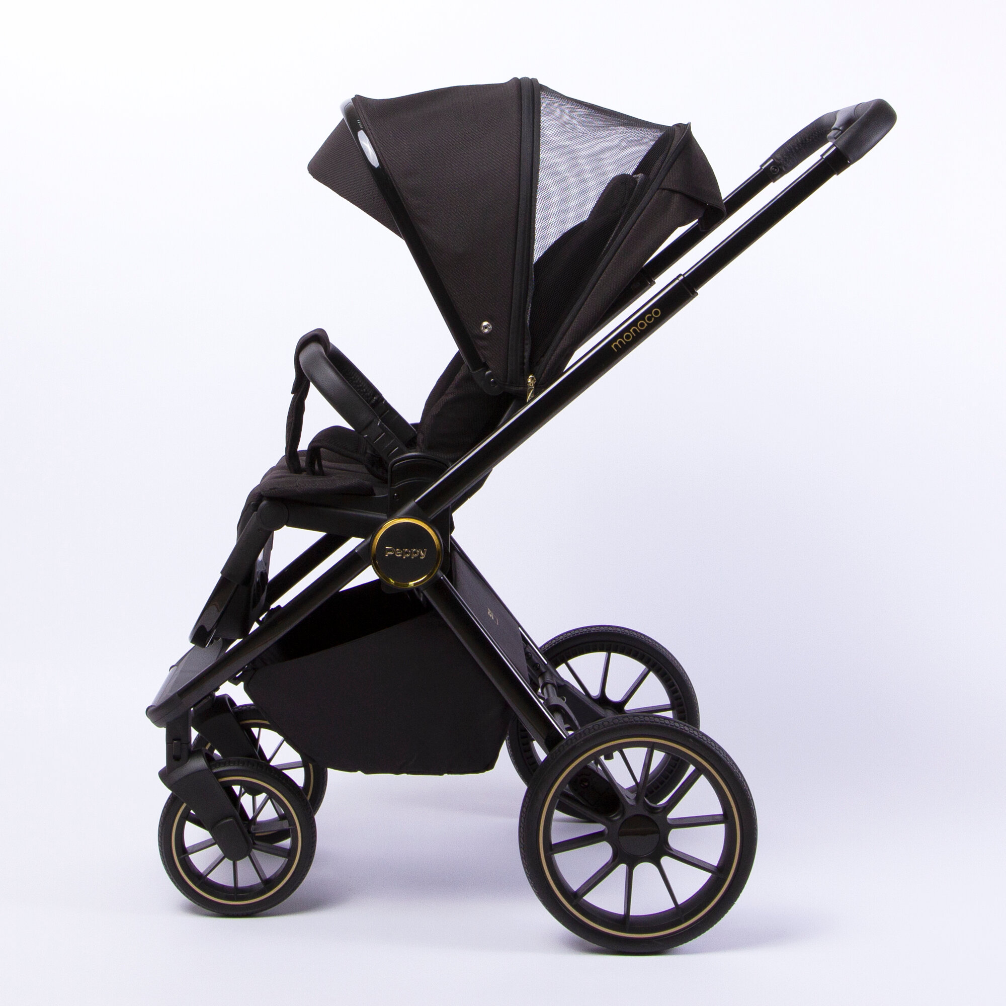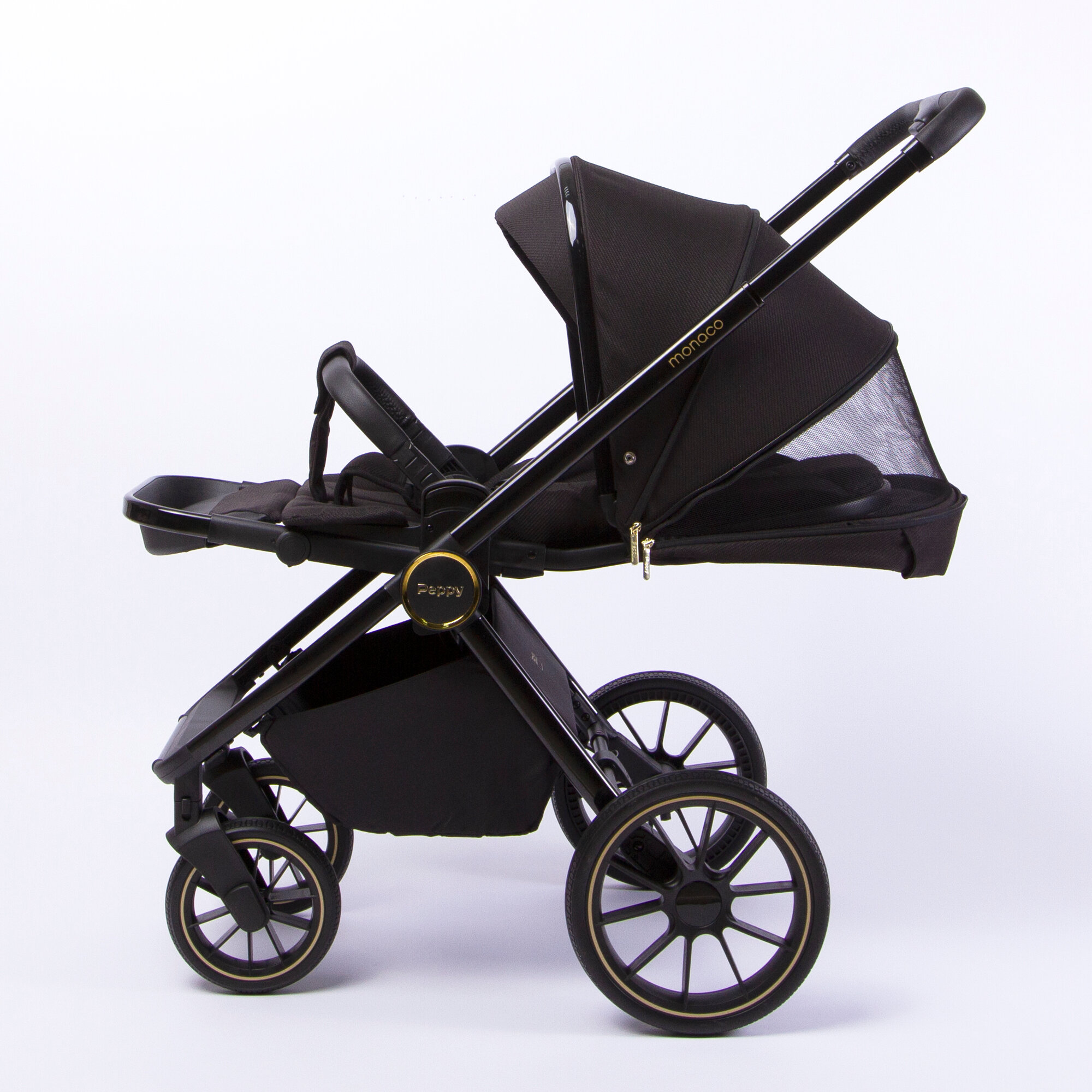 Коляска детская Peppy Monaco 2 в 1 GP Rose Black (черный), рама черн-золотая, шлифованный алюминий
