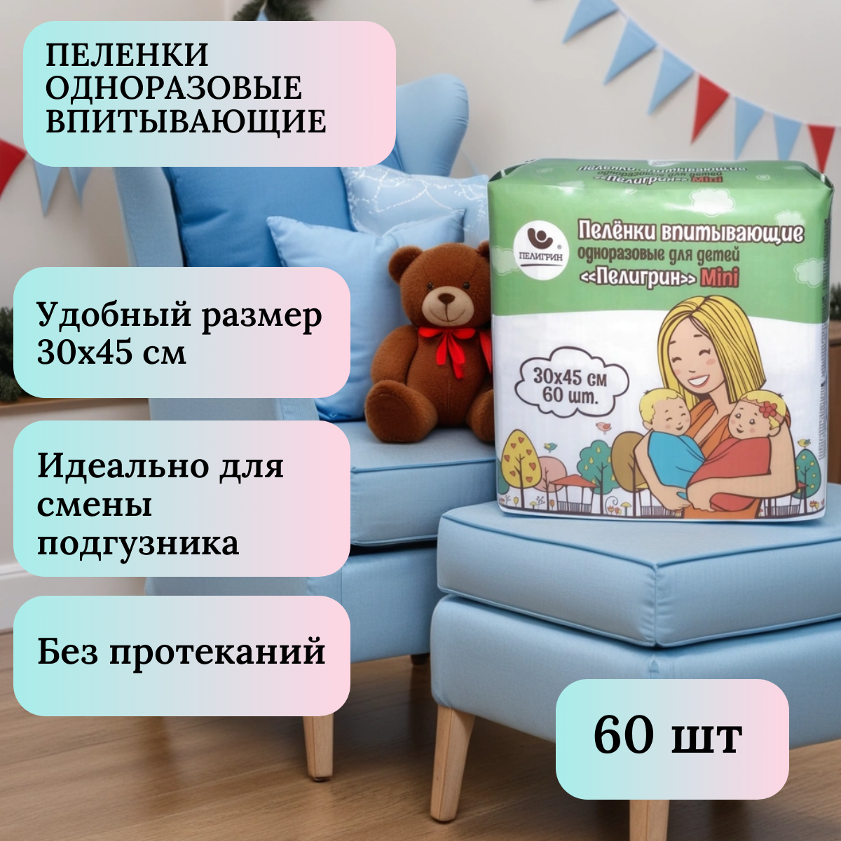 Пеленки одноразовые впитывающие Пелигрин, Mini 30х45 см, 60 шт. интересное: