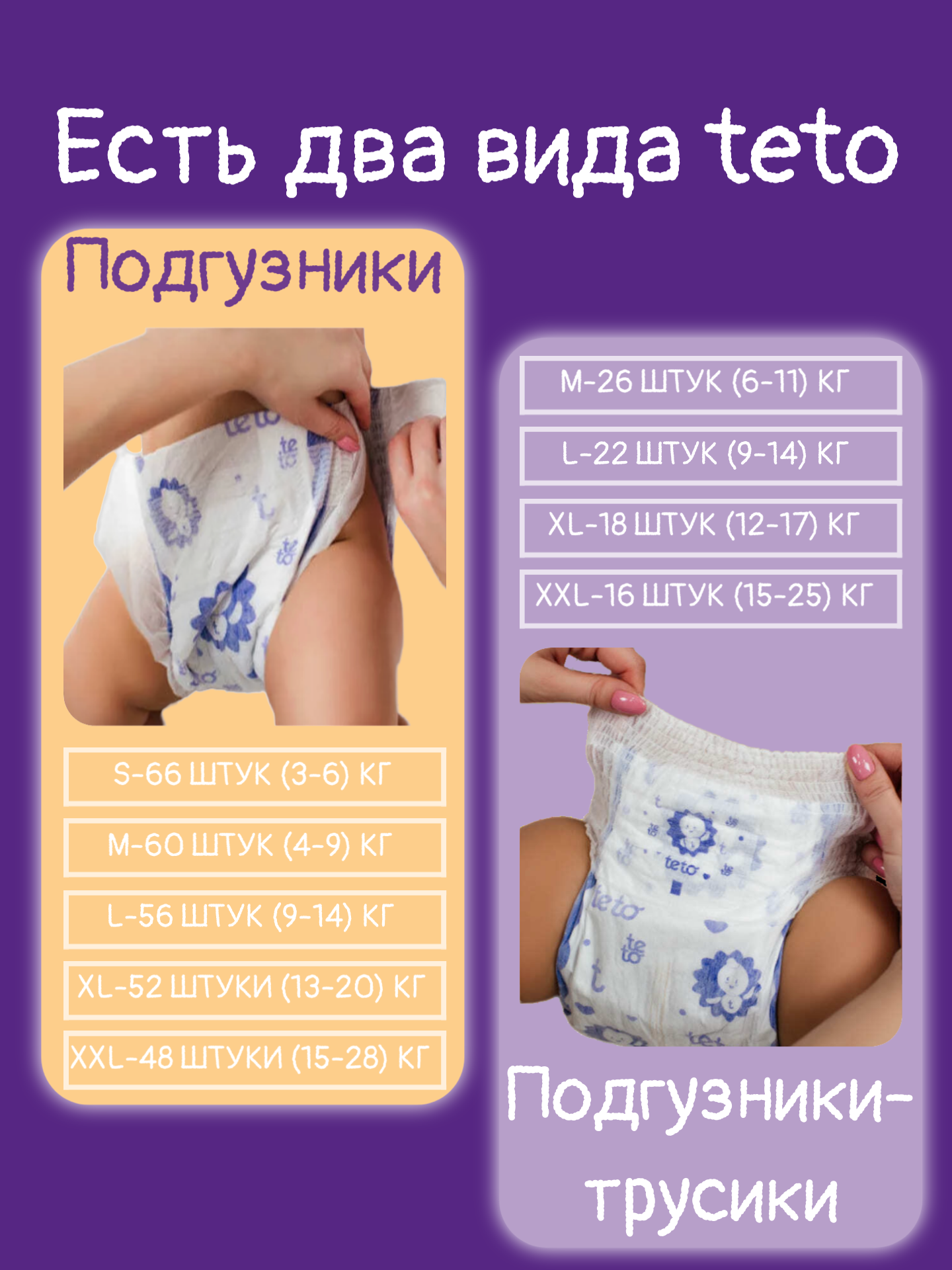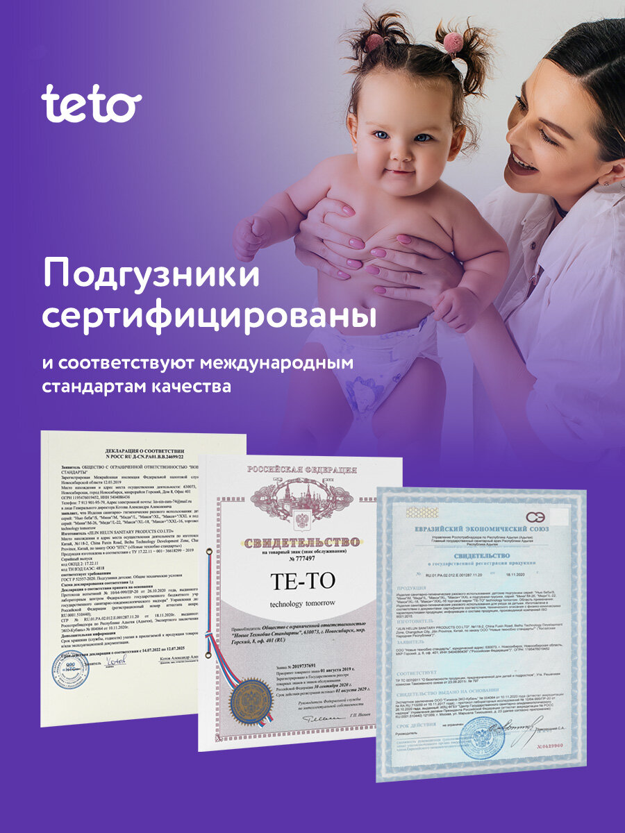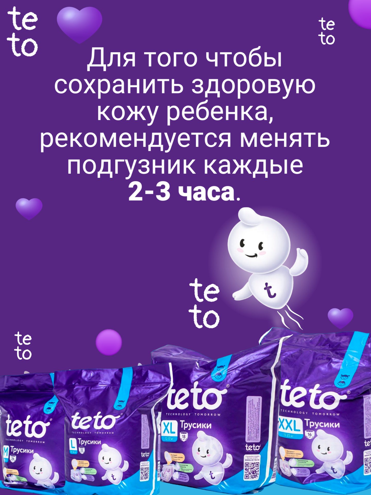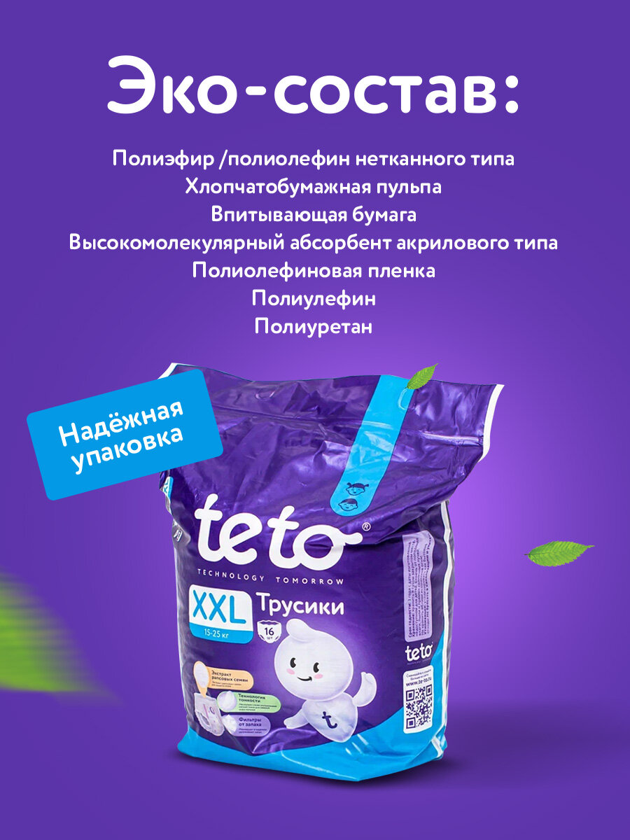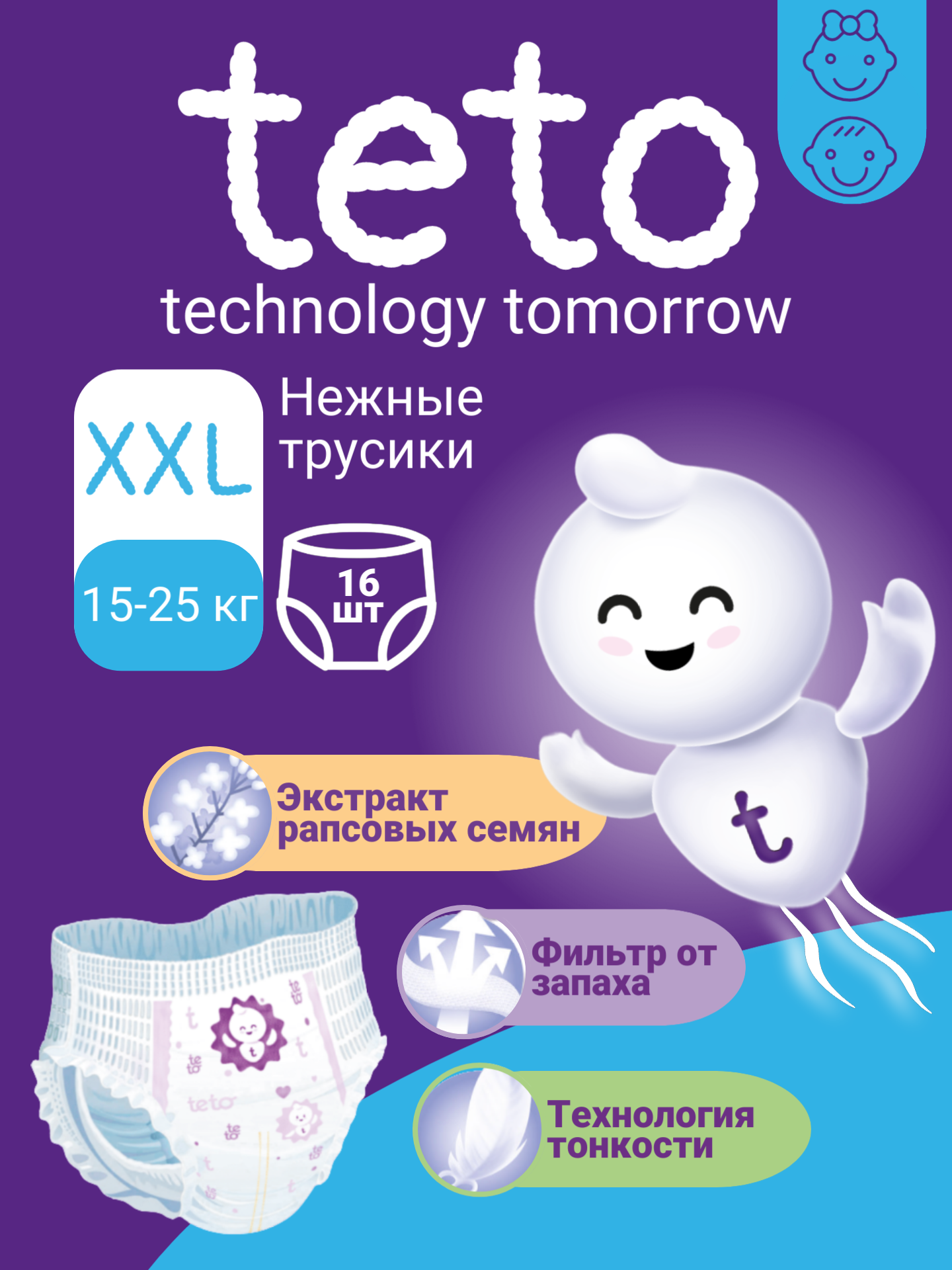 | Комплектация | Ультратонкие трусики-подгузники "ТЕТО", размер XХL, 16 штук, ТЕТО-TR-XХL-16 |