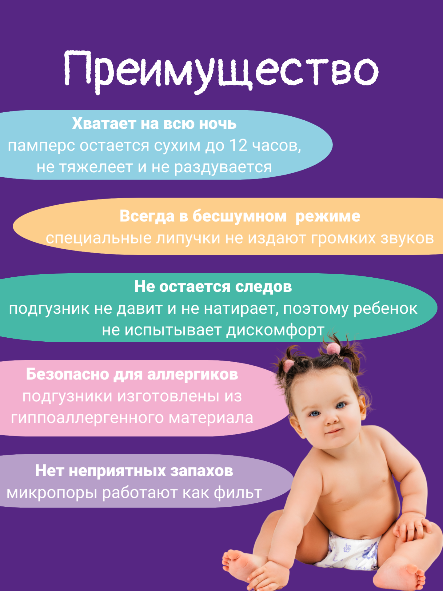 | Дополнительная информация | Товары для малыша легко надеть и снять, попробуйте и убедитесь! Мягкие и дышащие подгузники для активных малышей! Технологии завтрашнего дня! |