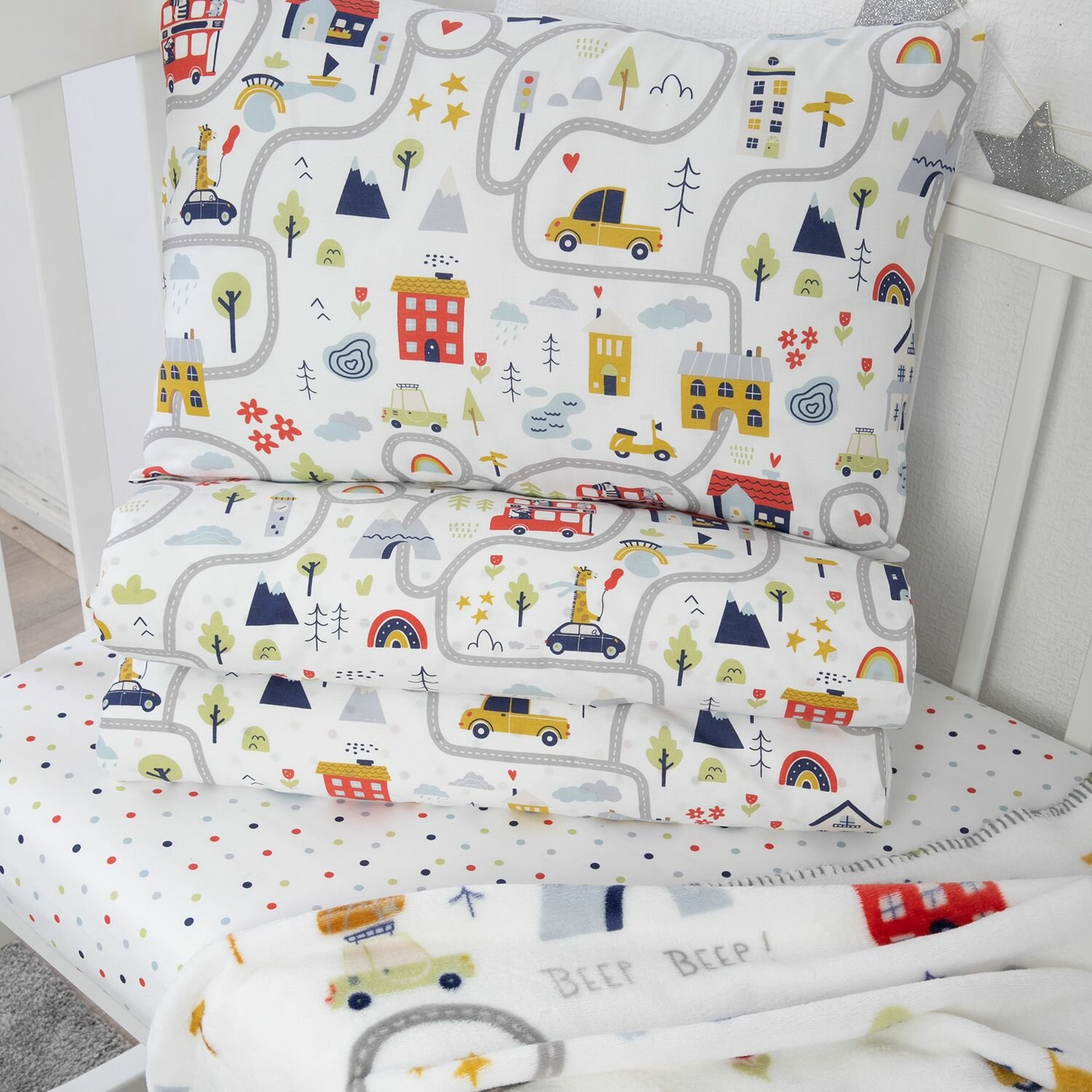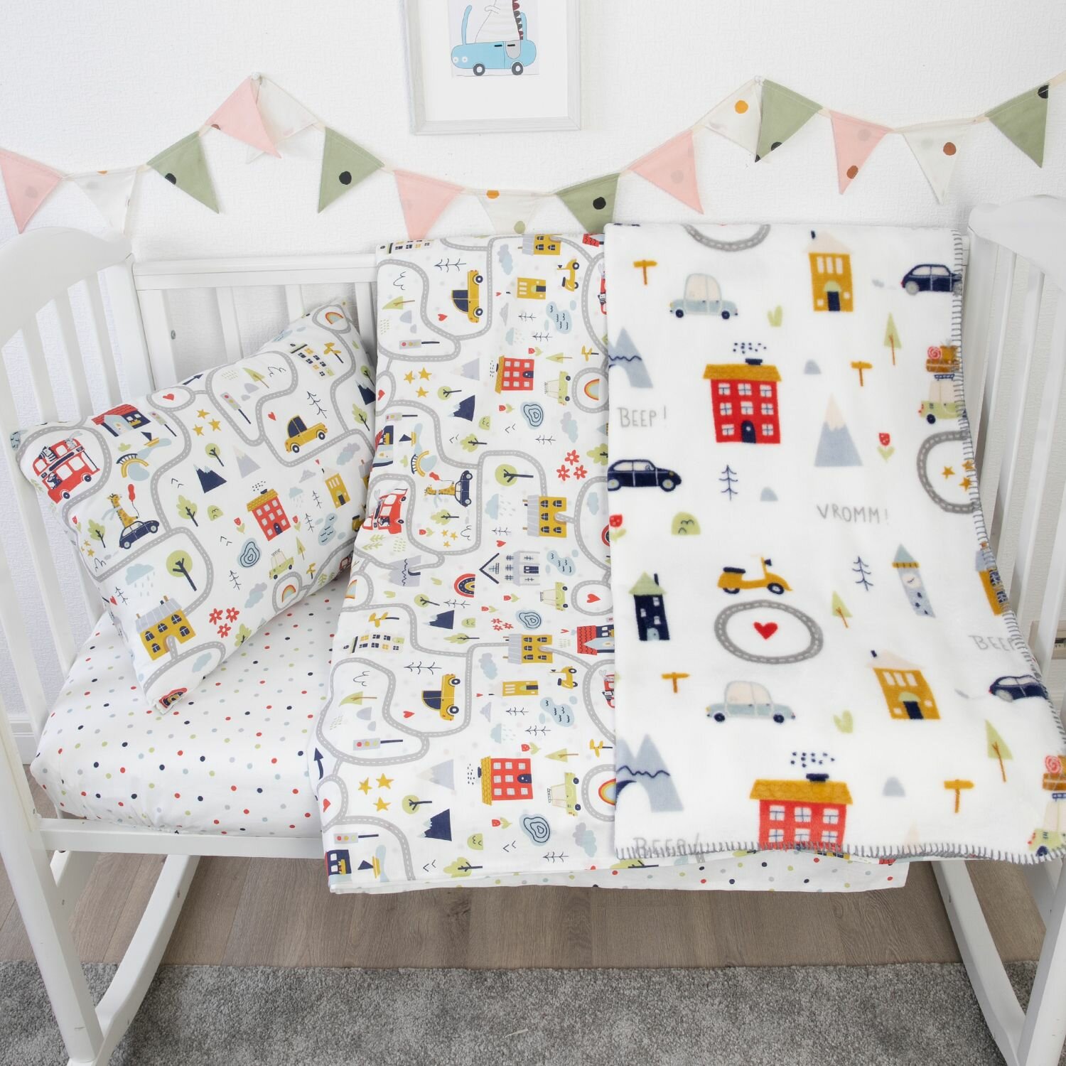Купить Постельное белье в кроватку для новорожденного + плед "Весёлые гонки" Подарочный набор