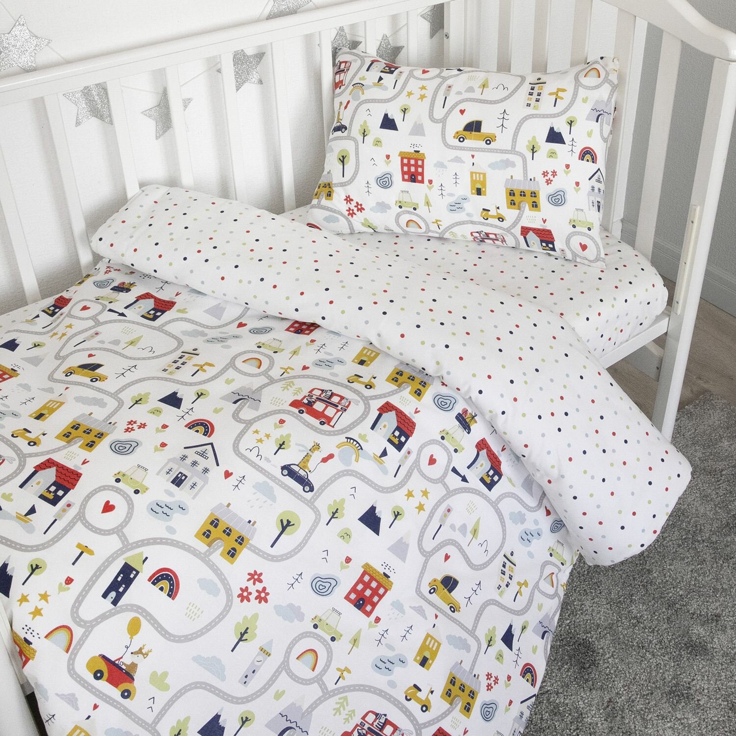 Постельное белье в кроватку для новорожденного + плед "Город игр" Подарочный набор