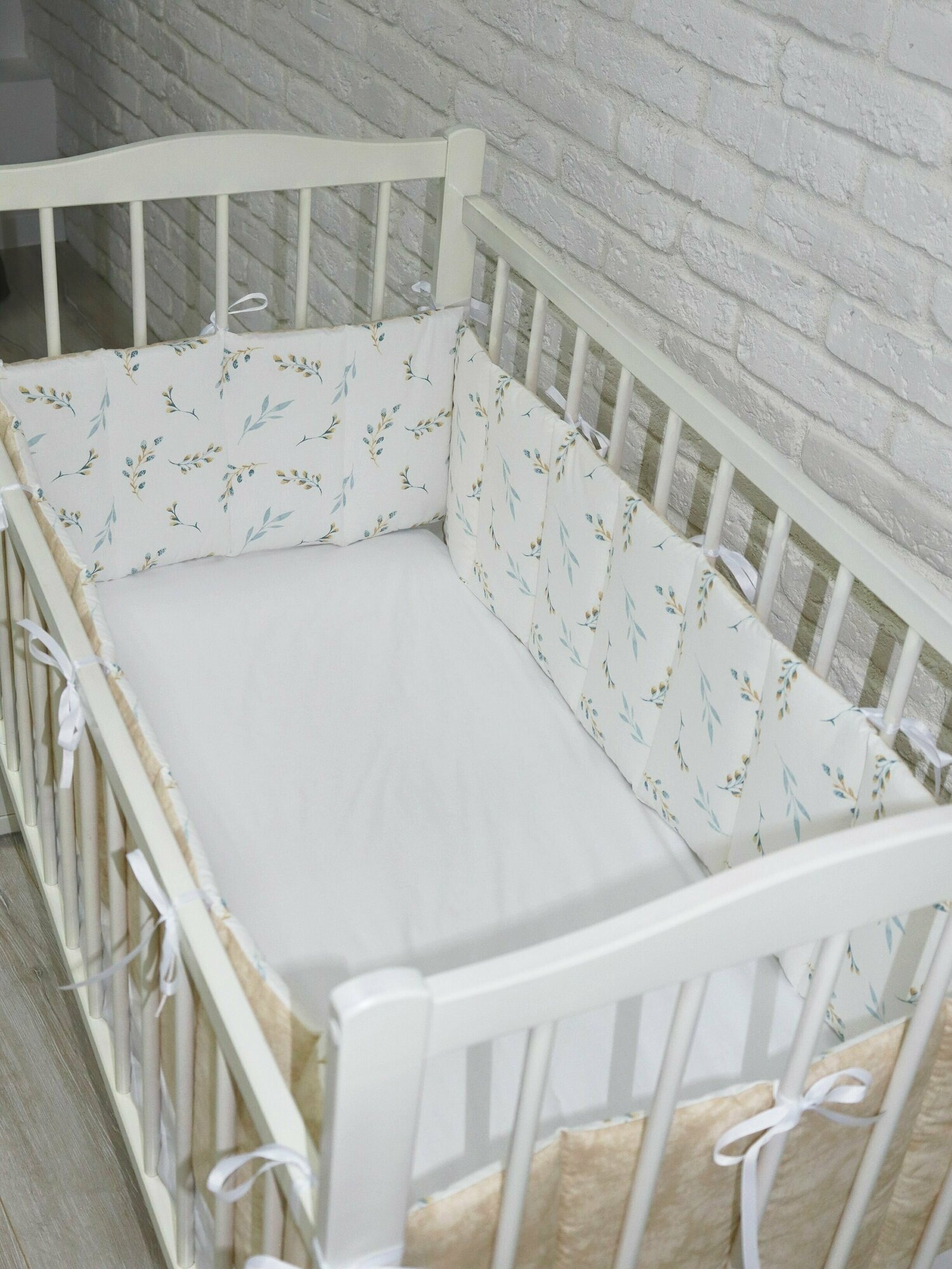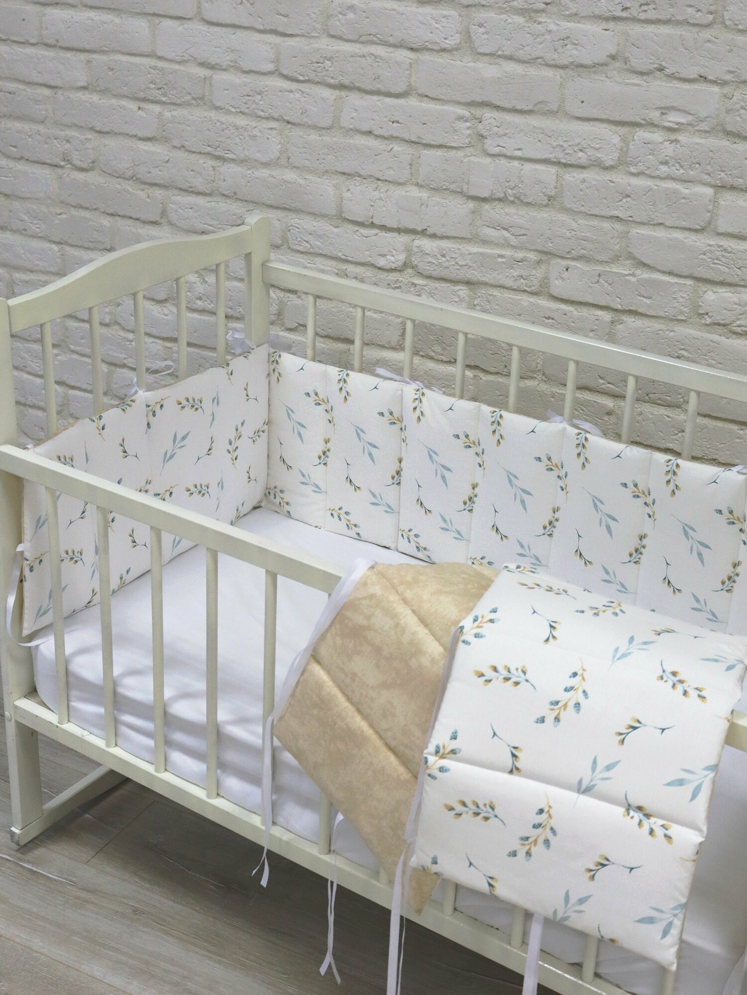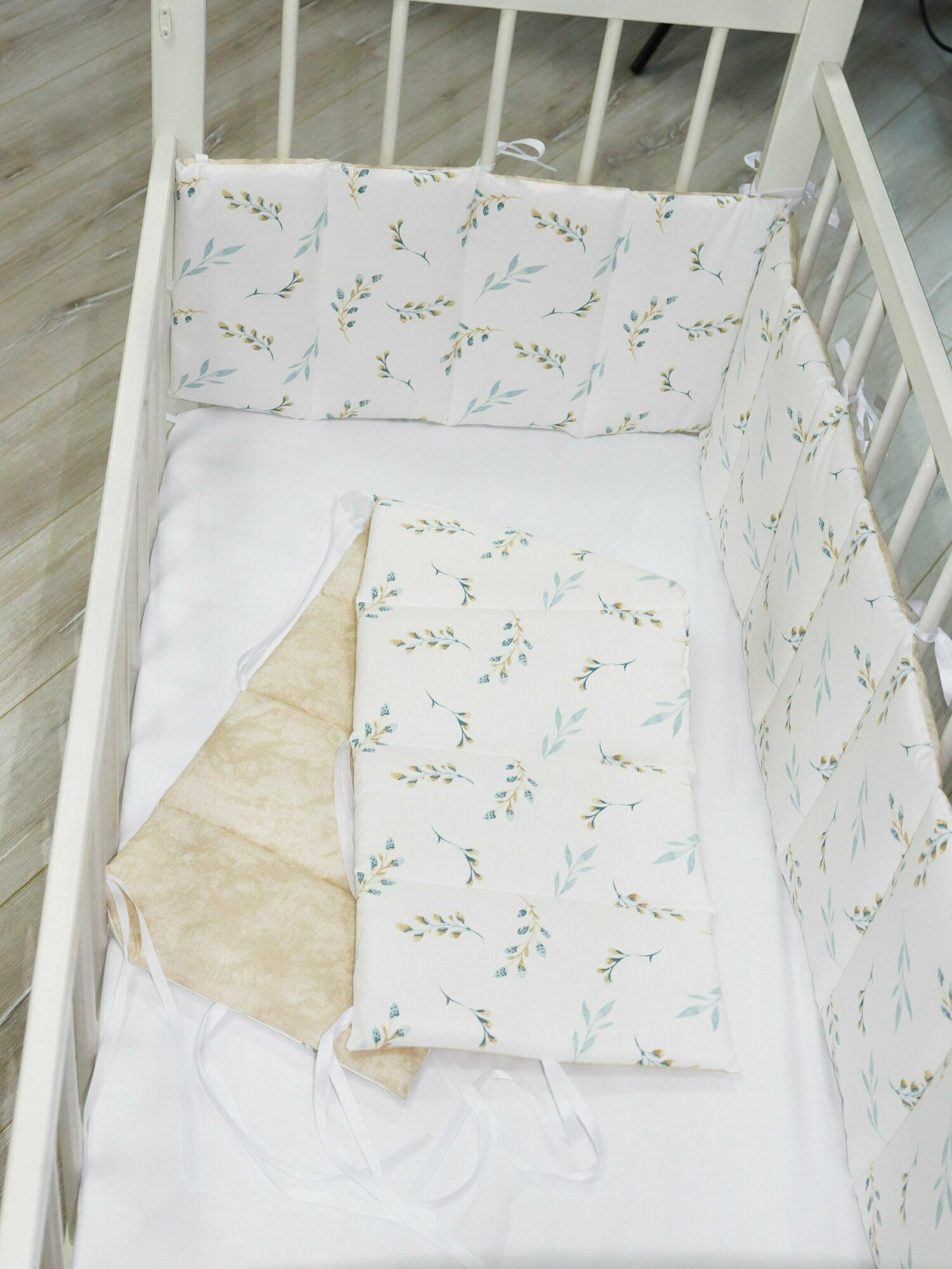 СохранитьКомплект стеганных бортиков в детскую кроватку, тонкие плоские бортики для защиты в кроватке веточки бежевые интересное: