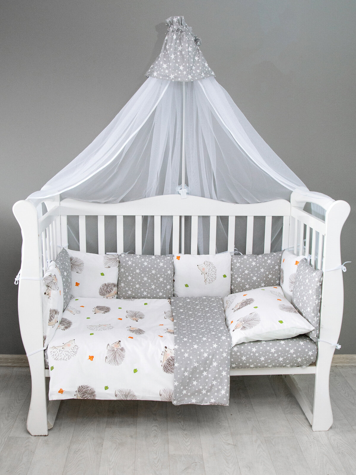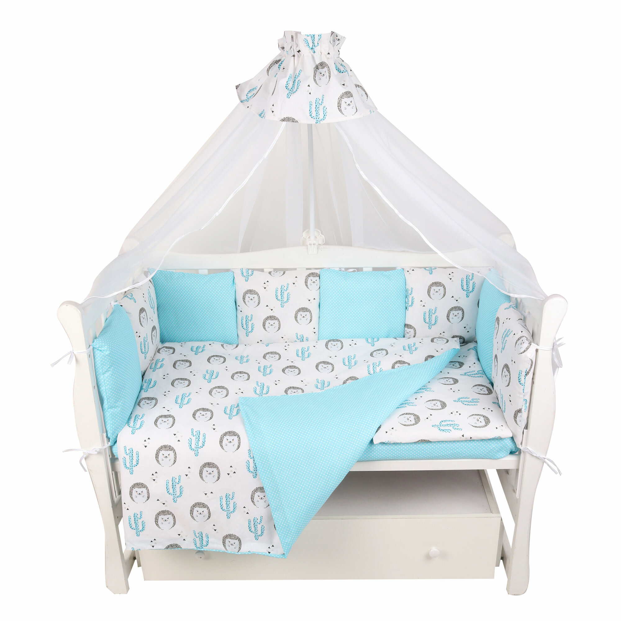 Комплект в кроватку 15 предметов (3+12 подушек-бортиков) AmaroBaby Ежики (бязь) интересное: