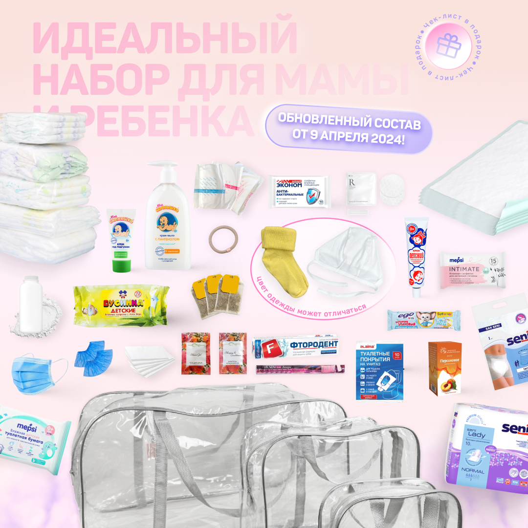 | Состав набора | бахилы, влажная туалетная бумага, влажные салфетки, мыло, носочки для новорожденного, одноразовые маски, одноразовые покрытия на сиденье унитаза, пеленки для мамы, пеленки для новорожденного, подгузники, прокладки для груди, прокладки послеродовые, трусики, шапочка для новорожденного |
