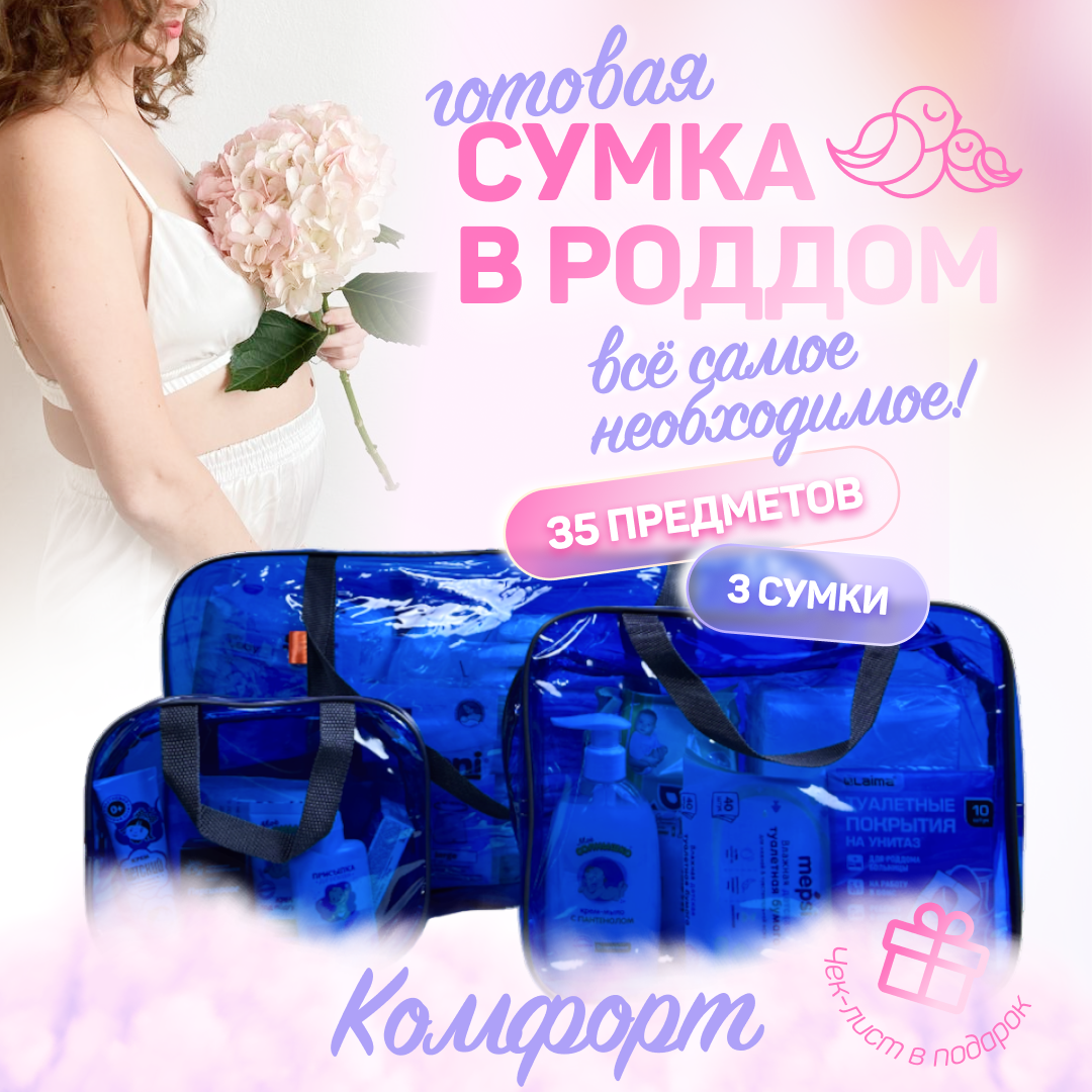 Купить Сумка в роддом готовая для мамы и малыша с наполнением, 35 предметов, 3 сумки, комплектация "Комфорт", синяя