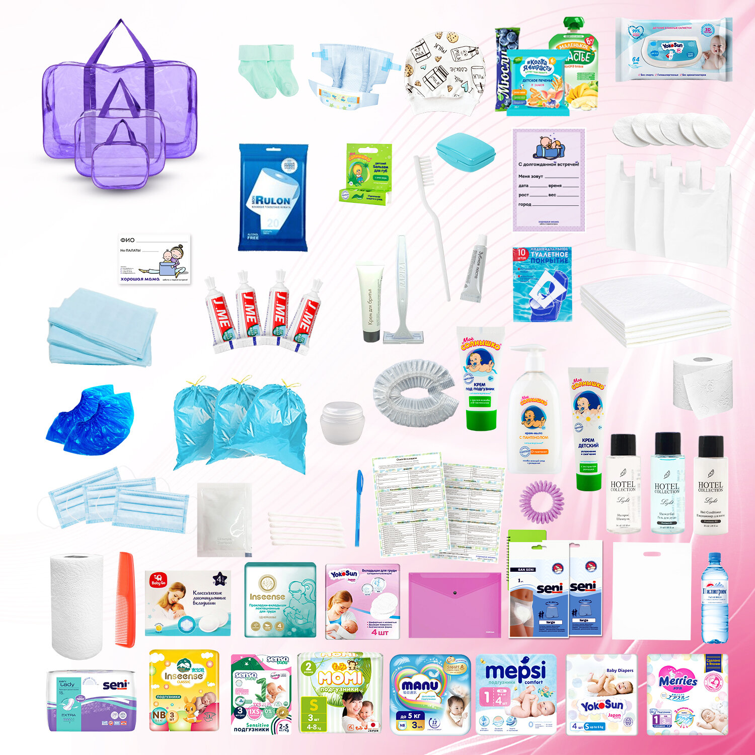 | Дополнительная информация | готовая сумка в роддом для мамы и малыша; готовая сумка в роддом набор; готовая сумка в роддом матовая; готовая сумка в роддом прозрачная; в роддом для мамы; в роддом; роддом набор; роддом; микс пробников подгузников; косметический набор в роддом |