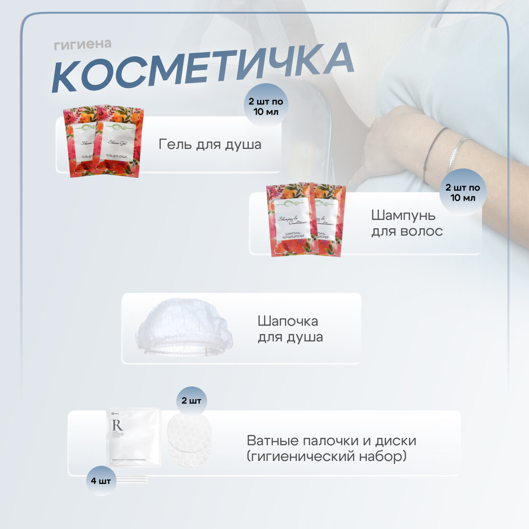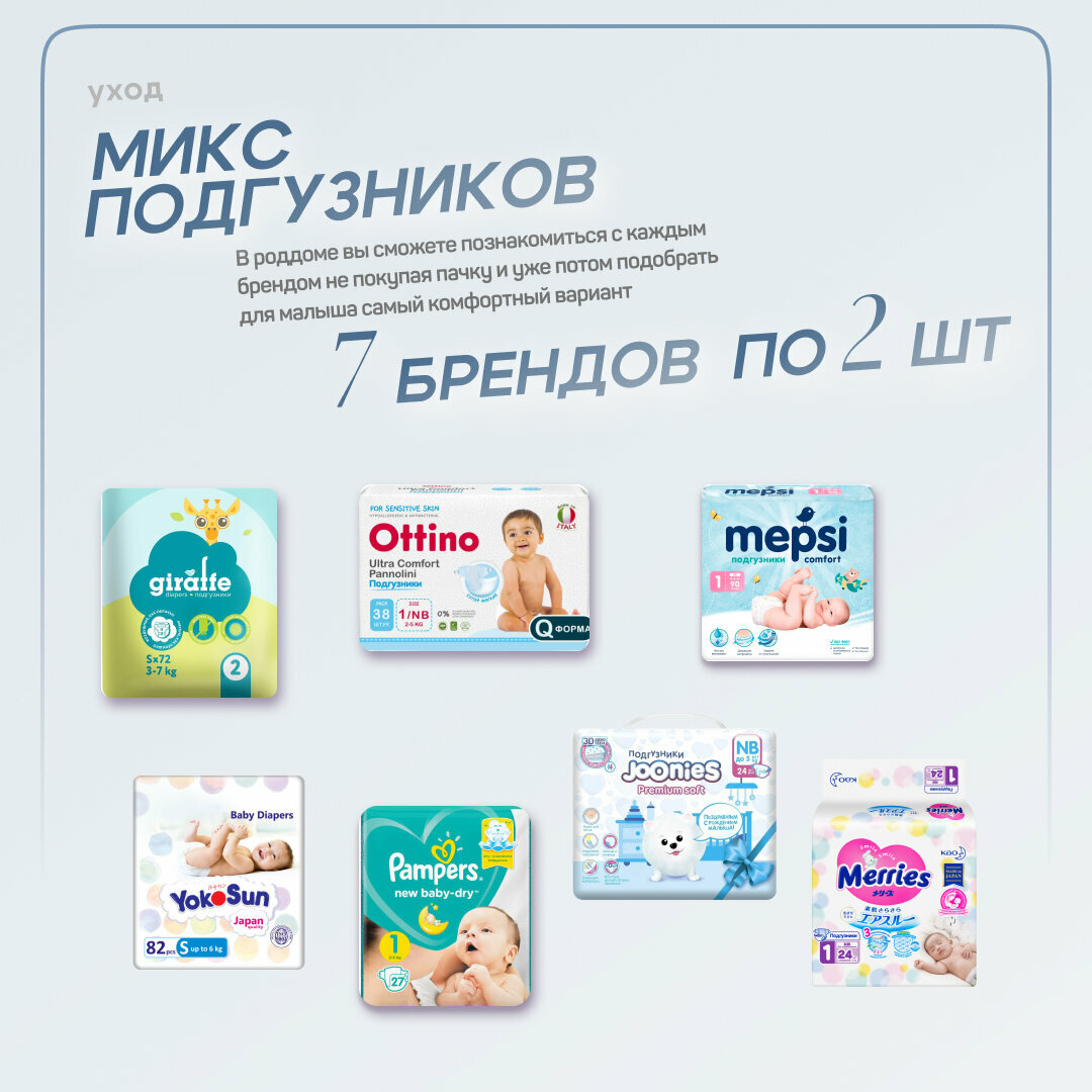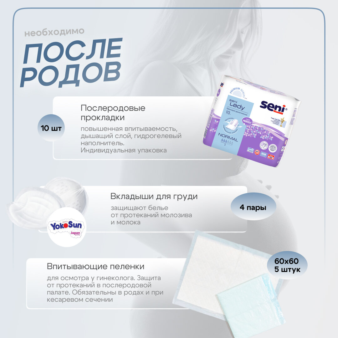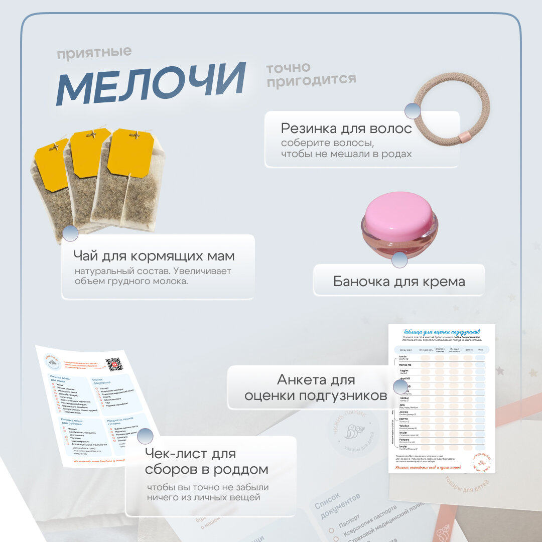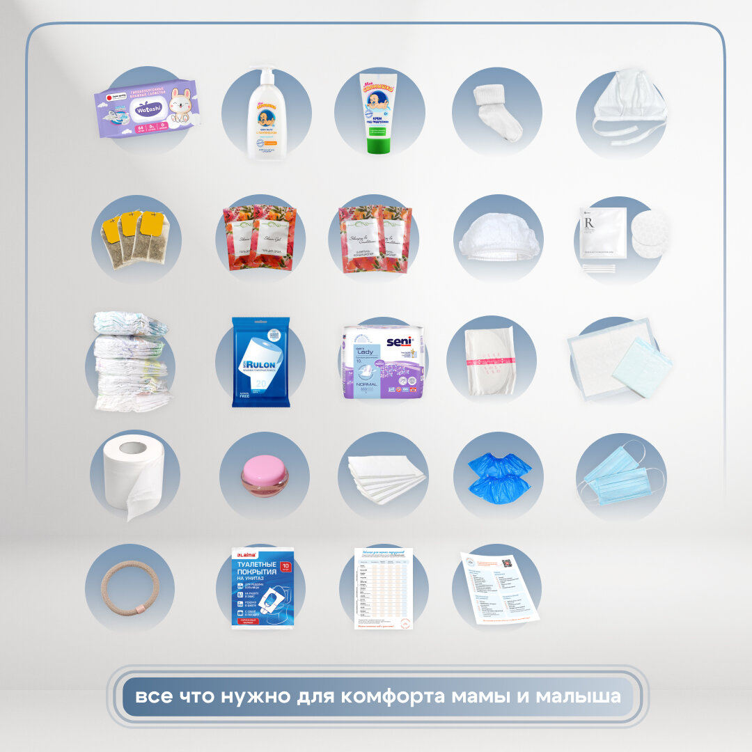 | Состав набора | бахилы, ватные диски, ватные палочки, влажная туалетная бумага, влажные салфетки, крем для сосков, одноразовые маски, одноразовые покрытия на сиденье унитаза, пеленки для новорожденного, подгузники |