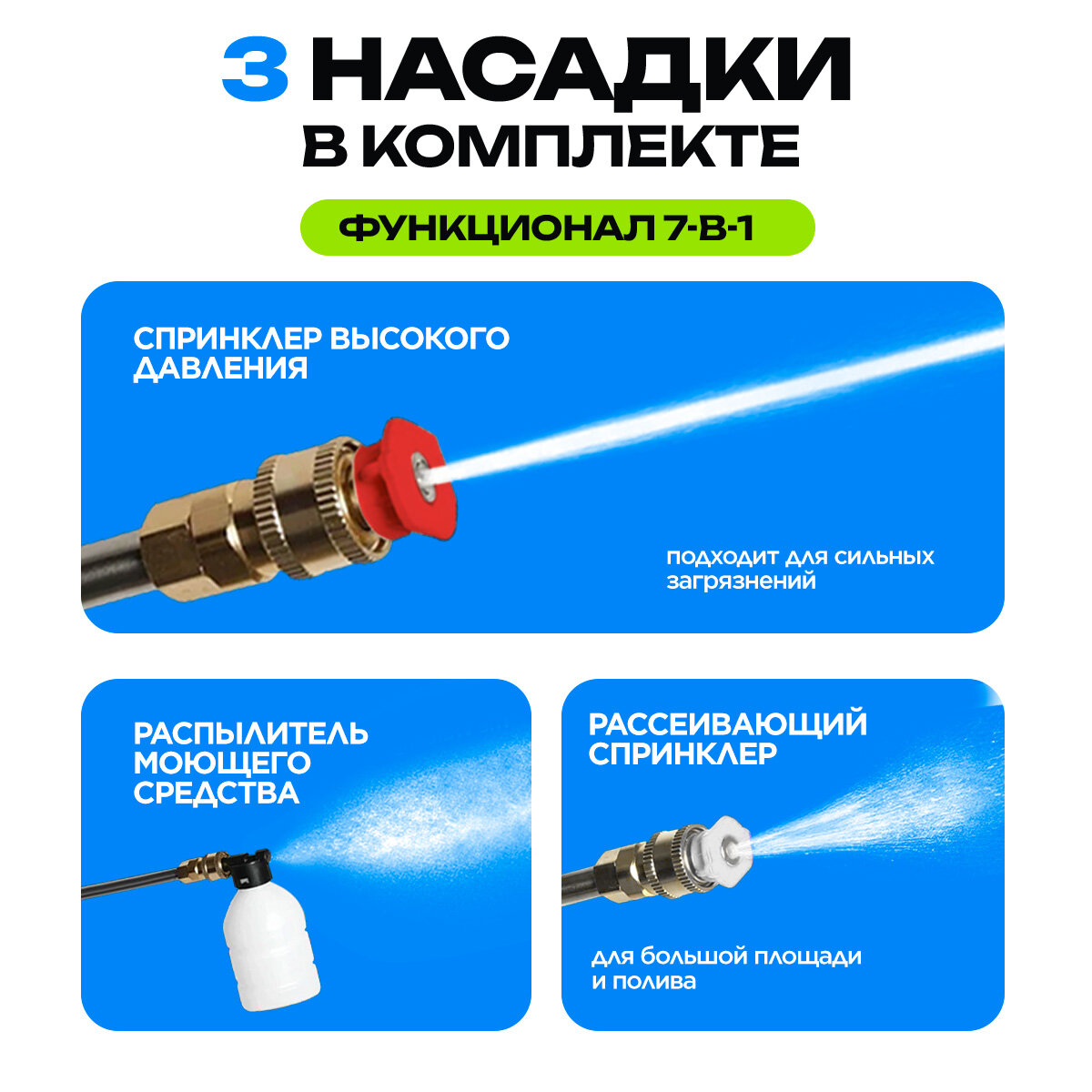 | Подробная комплектация | автомойка, 2 аккумулятора, кейс для хранения, шланг 5 м, адаптер для зарядки, переходник, удлинительная трубка, фильтр для воды, спринклер 2 шт, емкость для чистящего средства с распылителем |
