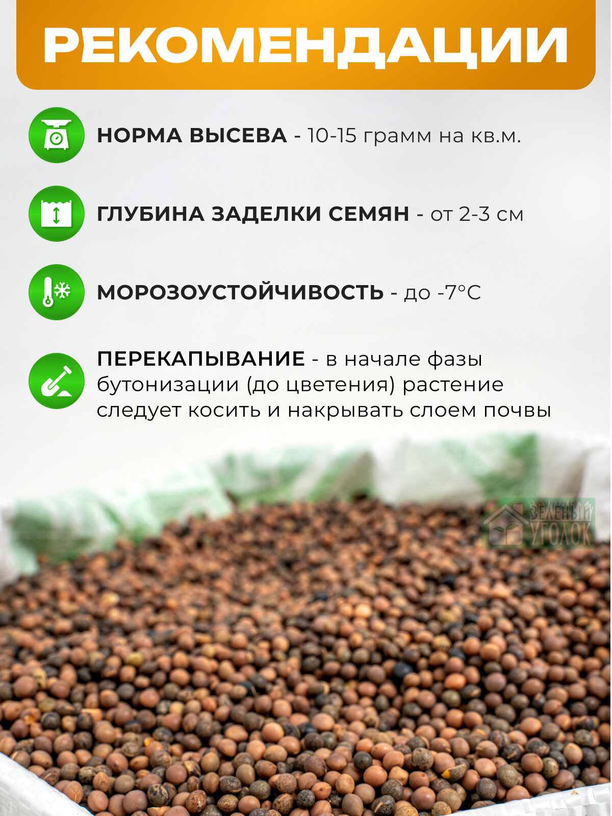 | Дополнительная информация | Семена сеют на глубину 2-3 см с расстоянием между рядками 7-12 см или высевают произвольно по всей площади посадки. Оптимальный срок высева семян — конец апреля, начало мая или за полтора месяца до наступления холодов. Растения выдерживают заморозки до 5-7°C. Заделка в почву зеленой массы, осуществляется 1-2 раза за сезон. |