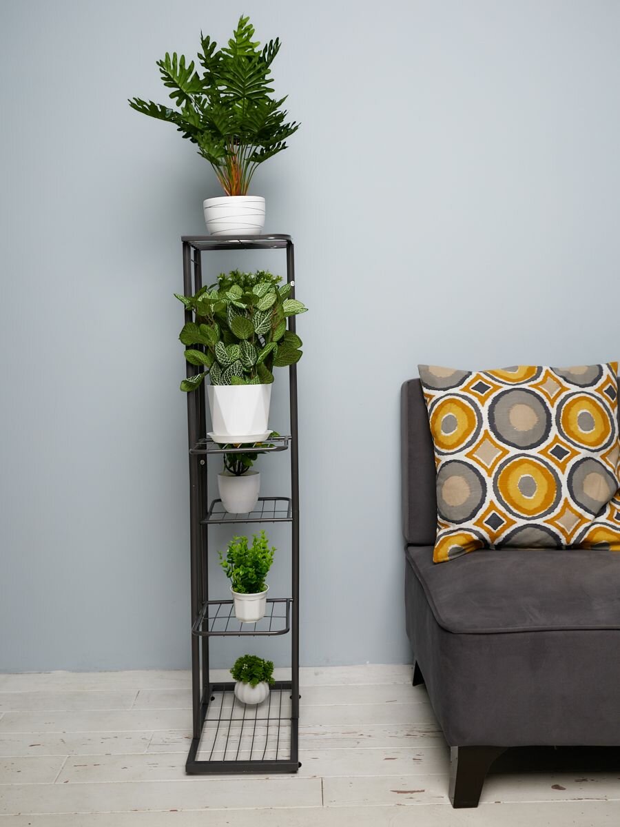 RombiLux Подставка для цветов металлическая высокая напольная или на подоконник на 5 кашпо. Серый графит