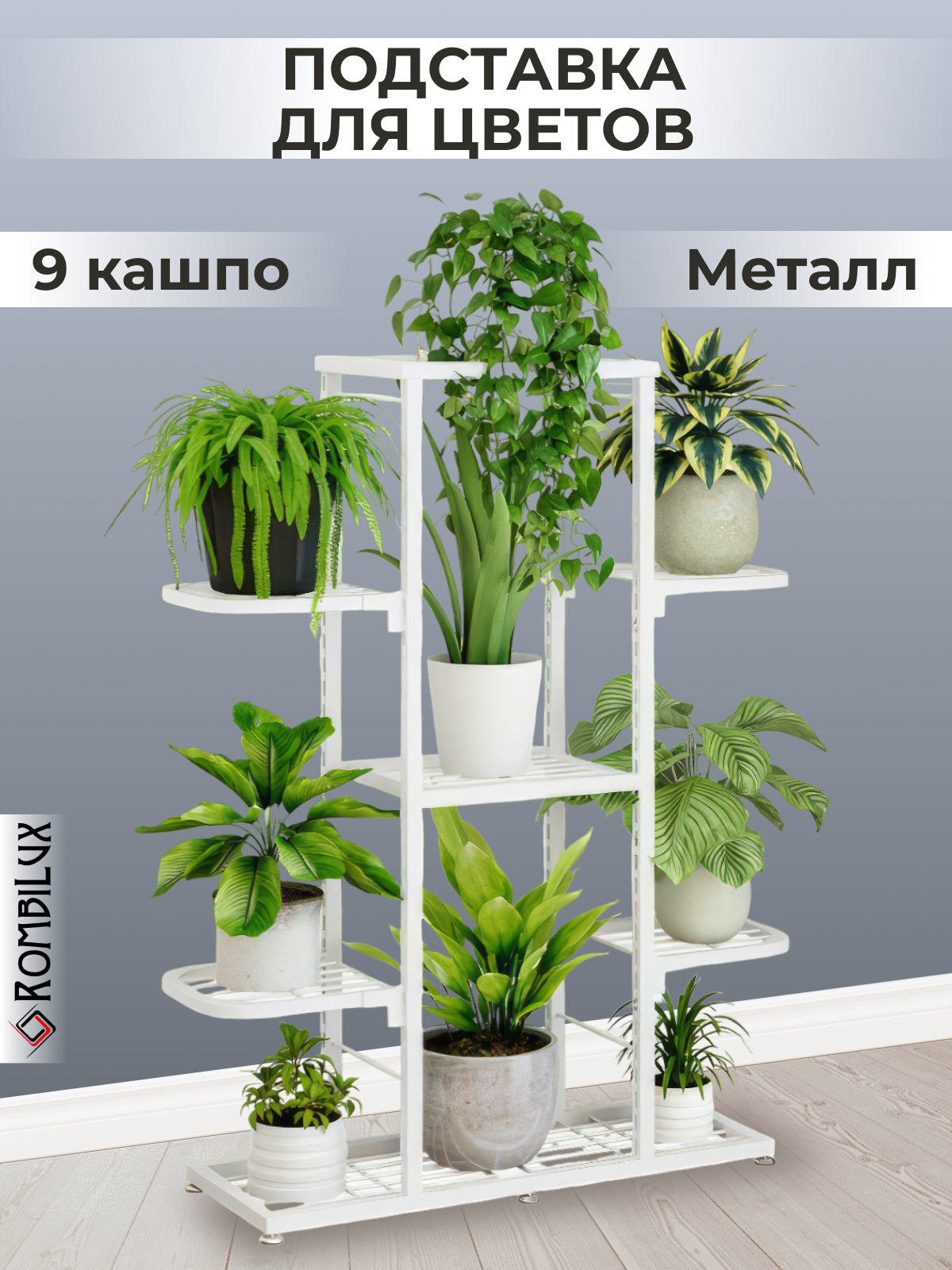 RombiLux Подставка для цветов металлическая напольная или на подоконник, на 9 растений, серый графит