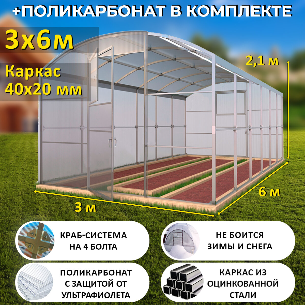 Купить Теплица Прямостенная (Поликарбонат в комплекте) 3 х 6 метров, оцинкованный каркас 40х20 мм - Царская Люкс