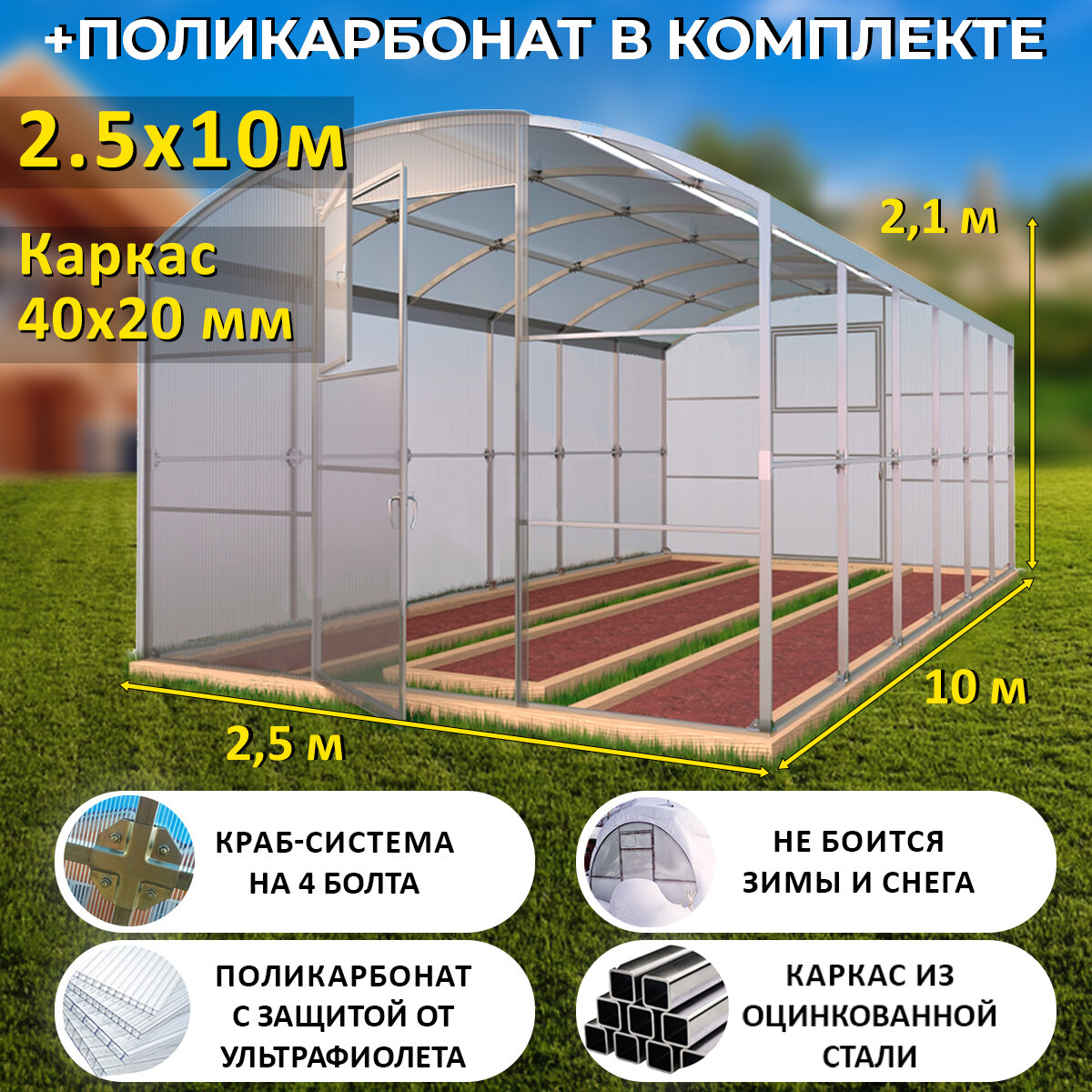 Купить Теплица Прямостенная (Поликарбонат в комплекте) 2.5 х 10 метров, оцинкованный каркас 40х20 мм - Царская Люкс