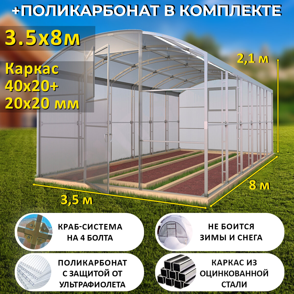 СохранитьТеплица Прямостенная (Поликарбонат в комплекте) 3.5 х 8 метров, оцинкованный каркас 40х20+20x20 мм - Царская Премиум интересное: