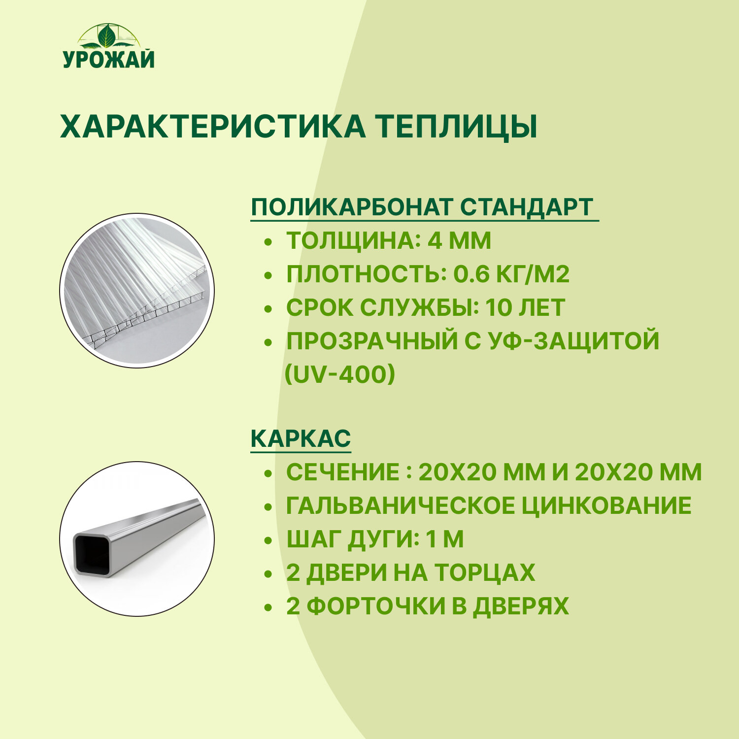 Теплица из поликарбоната 3x6 метров, арочная, усиленные двойные дуги 20x20 мм, 2 двери и 2 форточки