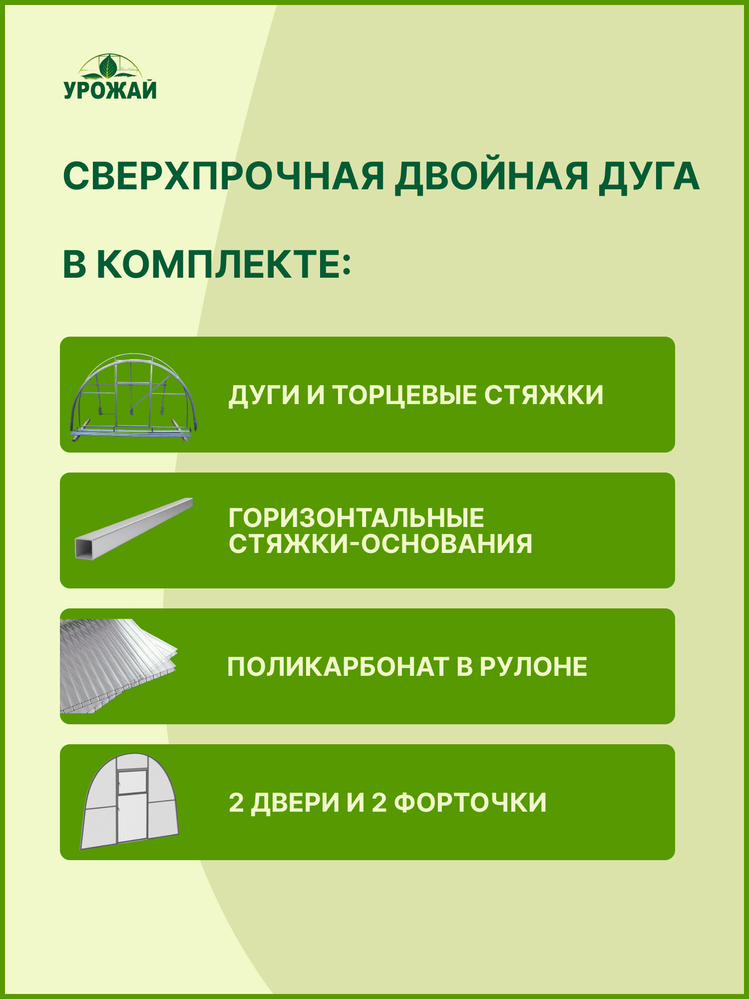 Теплица из поликарбоната 3x4 метра, арочная, усиленные двойные дуги 20x20 мм, 2 двери и 2 форточки