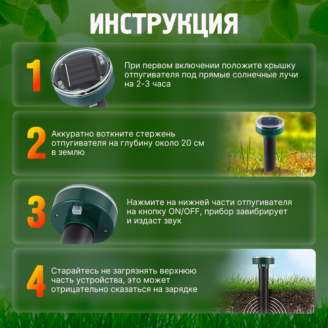 Отпугиватель кротов, мышей, змей, крыс, грызунов ультразвуковой, 4шт.