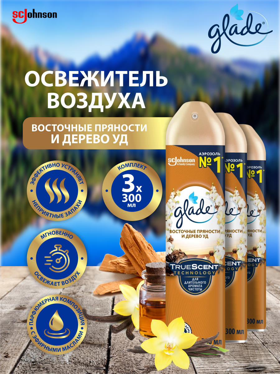 | Подробная комплектация | Освежитель воздуха Glade, восточные пряности и дерево уд, 300 мл, 3 шт. |