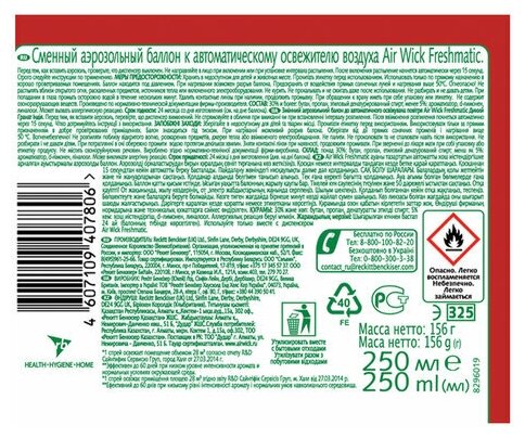 | Дополнительная информация | баллон для автоматического освежителя воздуха Air Wick Freshmatic; перед тем, как вставить аэрозоль, проверьте, что диспенсер выключен; не направляйте в лицо при включении или при установке интервала распыления; после включения распыление начнется автоматически через 15 сек |