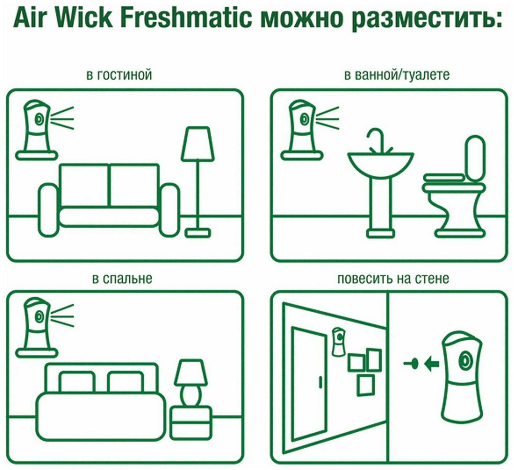| Дополнительная информация | баллон для автоматического освежителя воздуха Air Wick Freshmatic; перед тем, как вставить аэрозоль, проверьте, что диспенсер выключен; не направляйте в лицо при включении или при установке интервала распыления; после включения распыление начнется автоматически через 15 сек |