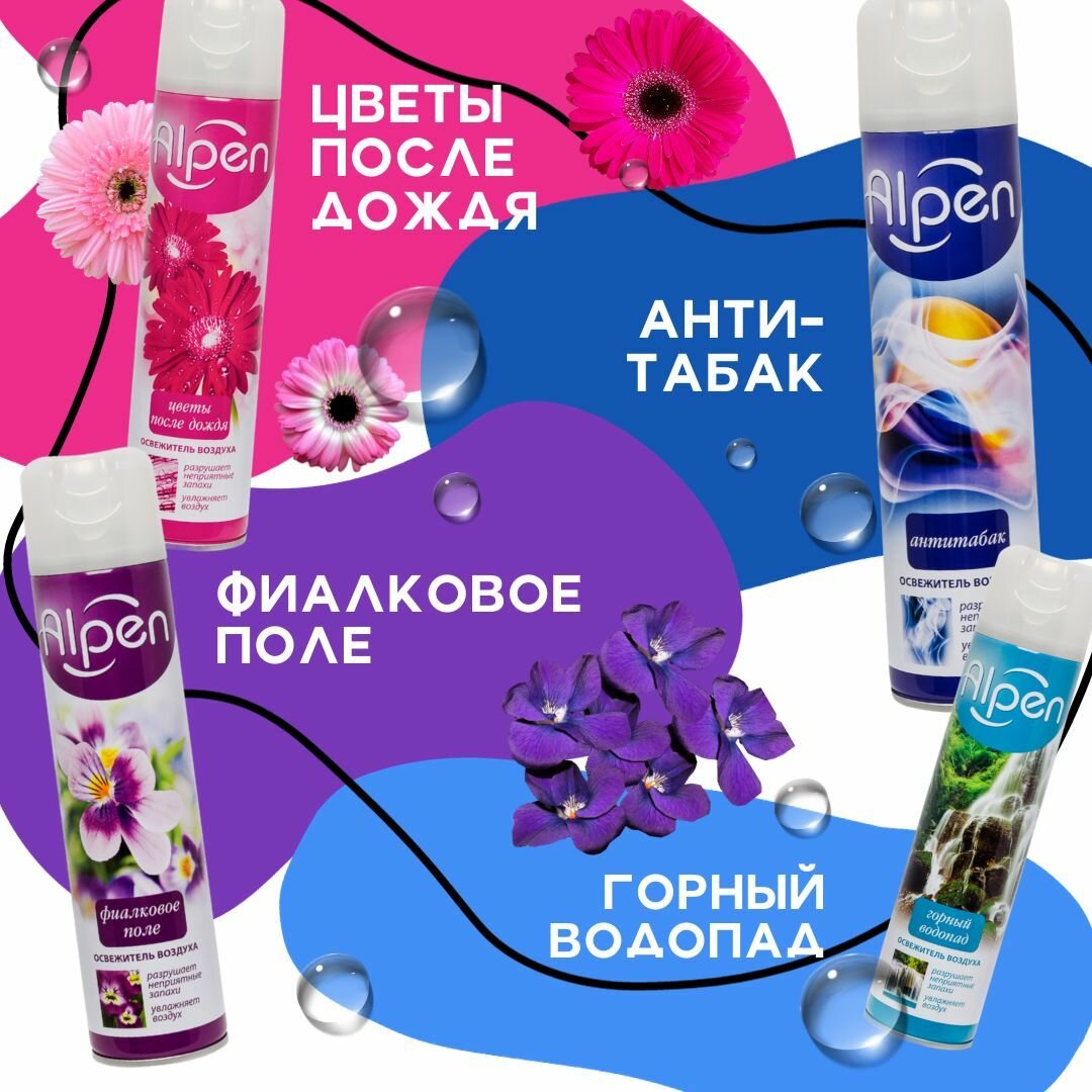 СохранитьНабор 4 шт освежитель воздуха Alpen антитабак, фиалковое поле, цветы после дождя и горный водопад интересное: