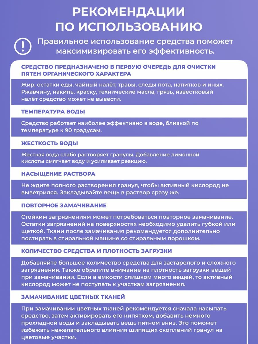 | Способ применения | Для активации экологического стирального порошка необходимо разбавить биоразлагаемый пятновыводитель кипятком (50°C и выше), после чего начнется химический процесс с выделением кислорода, способствующий расщеплению жирных пятен, устранению желтизны и любых загрязнений. |