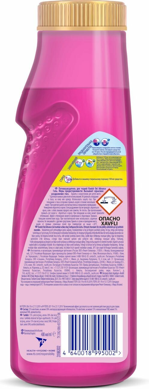 Ниже Вы можете прочитать отзывы на Пятновыводитель Vanish Oxi Advance, гель, кислородный, 400 мл, ознакомится с подробными характеристиками, посмотреть интересные обзоры и фотографии на Пятновыводитель Vanish Oxi Advance, гель, кислородный, 400 мл.