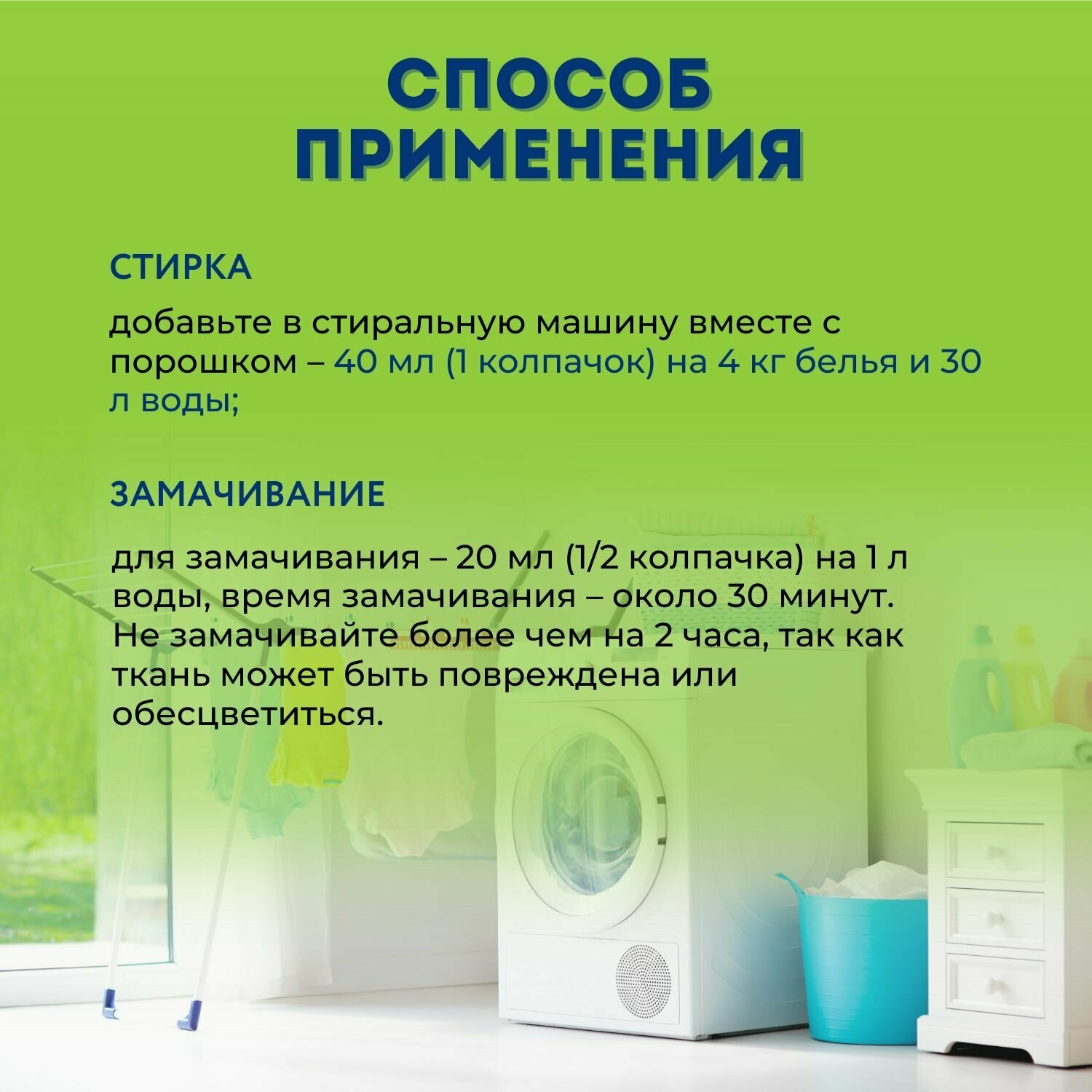| Способ применения | для стирки – добавьте в стиральную машину вместе с порошком – 40 мл (1 колпачок) на 4 кг белья и 30 л воды; для замачивания – 20 мл на 1 л воды, время замачивания – около 30 минут |