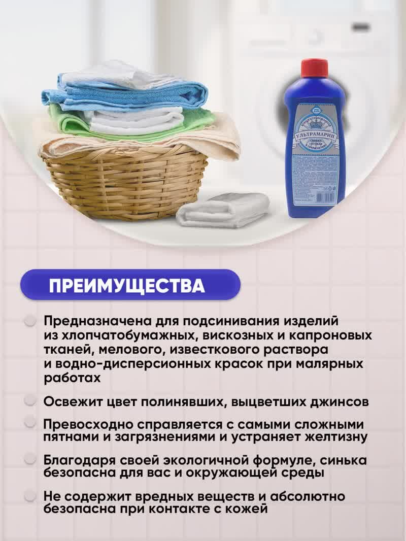 | Способ применения | при ручном подсинивании растворить необходимое количество синьки в 10л воды (30-40°С). При машинной стирке синьку перемешать с моющим раствором. Выстиранное белье прополоскать. |