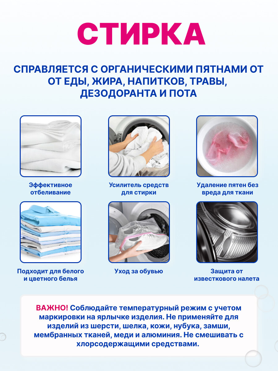 | Способ применения | Для стирки: для усиления действия порошка добавить 1 мерную ложку средства, 2 мерных ложки - для отбеливания. Для чистки сантехники: растворить 1 мерную ложку средства в 1 литре горячей воды. Нанести полученный раствор на поверхность и подождать 15-20 минут. При сильном загрязнении рекомендуется использовать щетку для очистки поверхности. Для чистки мебели и ковровых покрытий: растворить 1 мерную ложку средства в 1 литре горячей воды. Нанести полученный раствор на поверхность и подождать 15-20 минут. При сильном загрязнении рекомендуется использовать щетку для очистки поверхности. Не применять для изделий из шерсти, шелка, кожи, нубука, замши, мембранных тканей, меди и алюминия. Не смешивать с хлорсодержащими средствами. |
