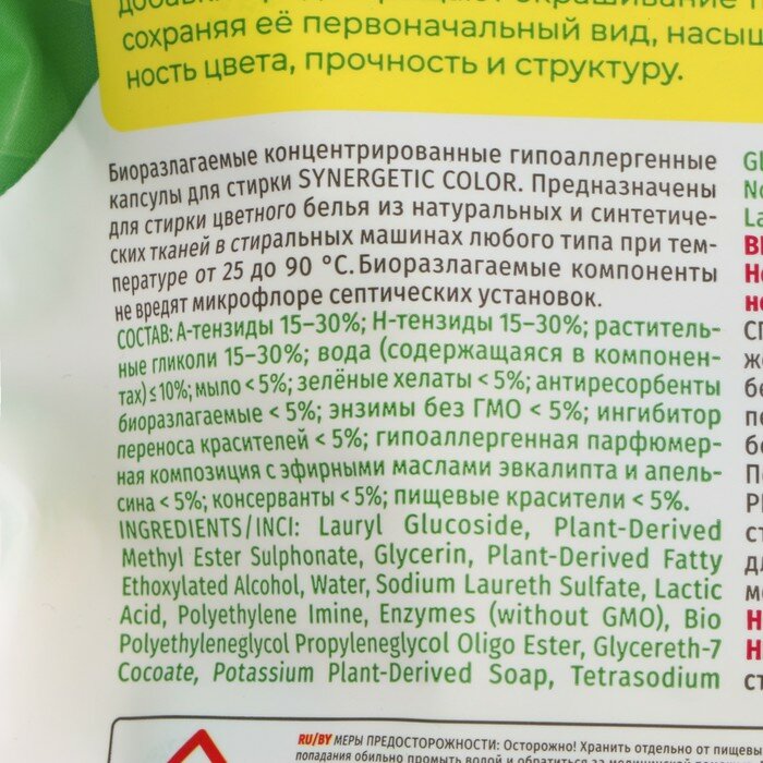 Купить Капсулы для стирки Synergetic COLOR для цветного белья, биоразлагаемые, гипоаллергенные, 40 шт