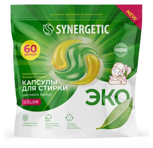 Капсулы для стирки Synergetic COLOR для цветного белья, биоразлагаемые, гипоаллергенные, 60 шт