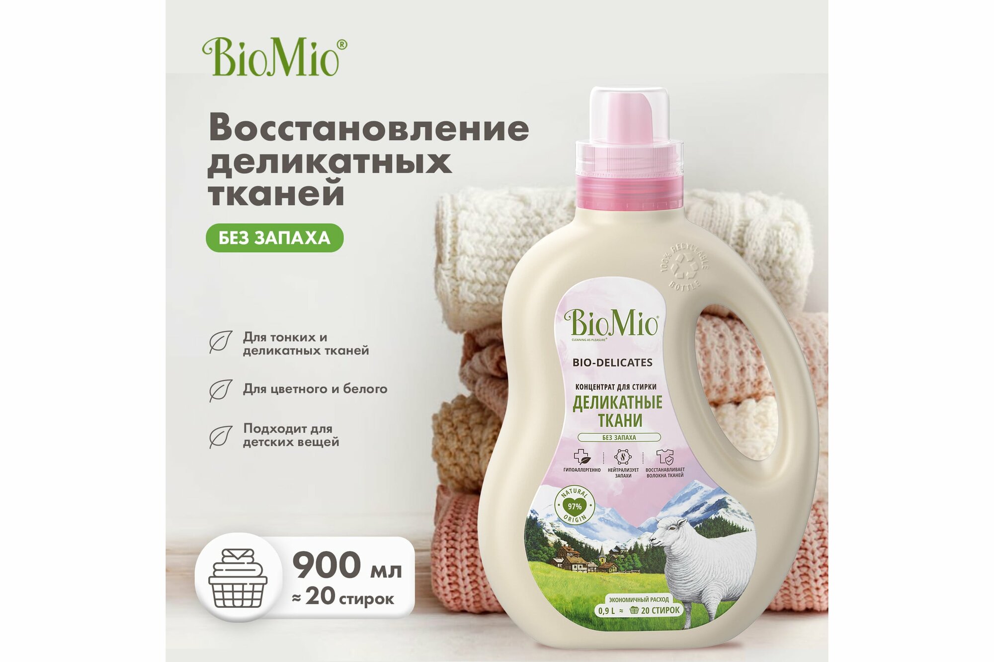 Экологичный гель для стирки деликатных тканей BioMio, жидкий порошок концентрат, без запаха, 900 мл