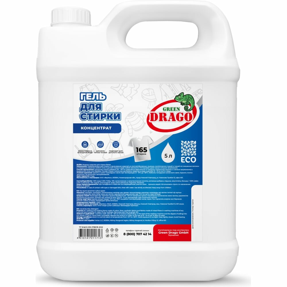 | Дополнительная информация | Концентрированное жидкое средство для стирки Green Drago. Предназначено для стирки и замачивания изделий из хлопчатобумажных, льняных, синтетических тканей и тканей из смешанных волокон в стиральных машинах любого типа и ручной стирки в воде любой жесткости. Отстирывает даже самые сильные загрязнения. Стирку вещей осуществлять при температуре 20-60°С. Для выбора способа стирки следуйте рекомендациям на ярлыках изделий. Перед использованием средство рекомендуется взболтать. |